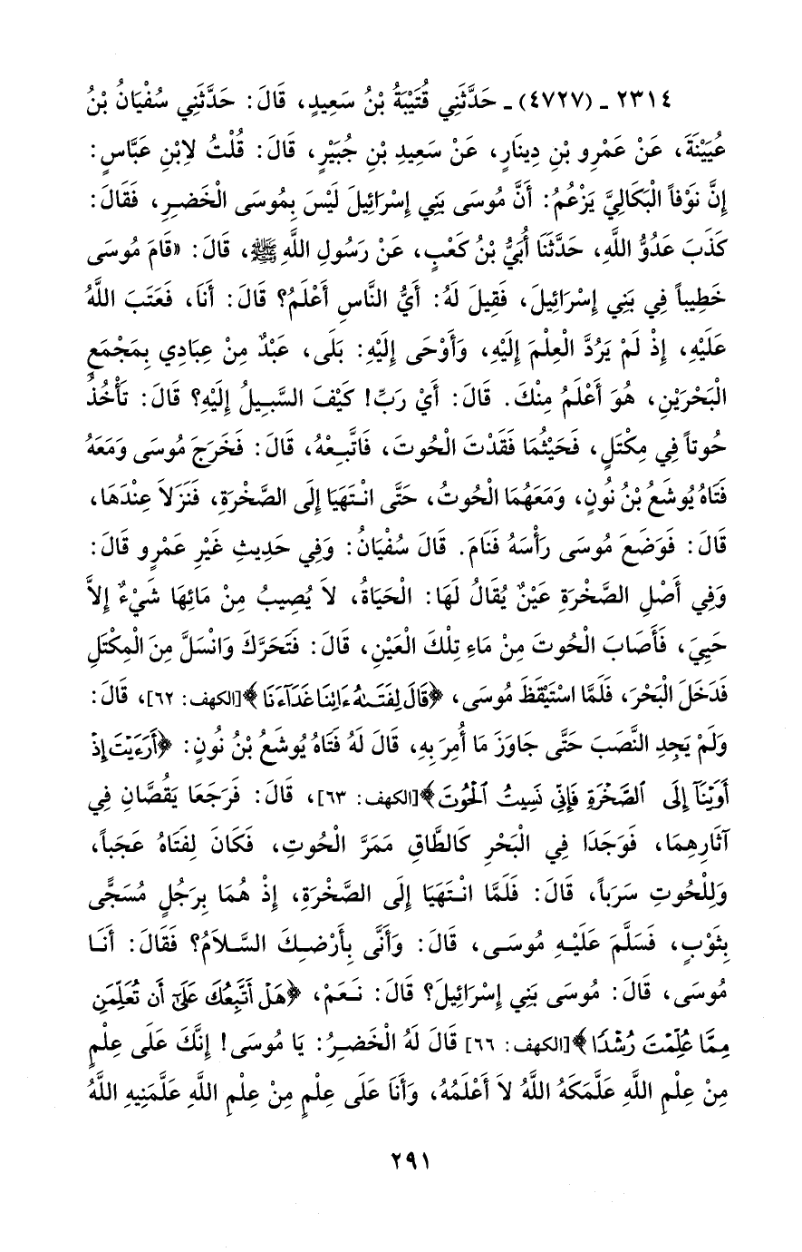2314 - (4727) - حَدَّثَنِي قُتَيْبَةُ بْنُ سَعِيدٍ، قَالَ: حَدَّثَنِي سُفْيَانُ بْنُ عُيَيْنَةَ، عَنْ عَمْرِو بْنِ دِينَارٍ، عَنْ سَعِيدِ بْنِ جُبَيْرٍ، قَالَ: قُلْتُ لاِبْنِ عَبَّاسٍ: إِنَّ نوفًا الْبَكَالِيَّ يَزْعُمُ: أَنَّ مُوسَى بَنِي إِسْرَائِيلَ لَيْسَ بِمُوسَى الْخَضِرِ، فَقَالَ: كَذَبَ عَدُوُّ اللَّهِ، حَدَّثَنَا أُبَيُّ بْنُ كَعْبٍ، عَنْ رَسُولِ اللَّهِ - صلى الله عليه وسلم -، قَالَ: "قَامَ مُوسَى خَطِيبًا فِي بَنِي إِسْرَائِيلَ، فَقِيلَ لَهُ: أَيُّ النَّاسِ أَعْلَمُ؟ قَالَ: أَنَا، فَعَتَبَ اللَّهُ عَلَيْهِ، إِذْ لَمْ يَرُدَّ الْعِلْمَ إِلَيْهِ، وَأَوْحَى إِلَيْهِ: بَلَى، عَبْدٌ مِنْ عِبَادِي بِمَجْمَع الْبَحْرَيْنِ، هُوَ أَعْلَمُ مِنْكَ. قَالَ: أَيْ رَبِّ! كَيْفَ السَّبِيلُ إِلَيْهِ؟ قَالَ: تَأْخُذُ حُوتًا فِي مِكْتَلٍ، فَحَيْثُمَا فَقَدْتَ الْحُوتَ، فَاتَّبِعْهُ، قَالَ: فَخَرَجَ مُوسَى وَمَعَهُ فتاهُ يُوشعُ بْنُ نُونٍ، وَمَعَهُمَا الْحُوتُ، حَتَّى انْتَهَيَا إِلَى الصَّخْرَةِ، فَنَزَلَا عِنْدَهَا، قَالَ: فَوَضَعَ مُوسَى رَأْسَهُ فَنَامَ. قَالَ سُفْيَانُ: وَفِي حَدِيثِ غَيْرِ عَمْرٍو قَالَ: وَفِي أَصْلِ الصَّخْرَةِ عَيْنٌ يُقَالُ لَهَا: الْحَيَاةُ، لَا يُصِيبُ مِنْ مَائِهَا شَيْءٌ إِلَّا حَيِيَ، فَأَصَابَ الْحُوتَ مِنْ مَاءِ تِلْكَ الْعَيْنِ، قَالَ: فتحَرَّكَ وَانْسَلَّ مِنَ الْمِكْتَلِ فَدَخَلَ الْبَحْرَ، فَلَمَّا اسْتَيْقَظَ مُوسَى، {قَالَ لِفَتَاهُ آتِنَا غَدَاءَنَا} [الكهف: 62]، قَالَ: وَلَمْ يَجدِ النَّصَبَ حَتَّى جَاوَزَ مَا أُمِرَ بِهِ، قَالَ لَهُ فتاهُ يُوشعُ بْنُ نُونٍ: {أَرَأَيْتَ إِذْ أَوَيْنَا إِلَى الصَّخْرَةِ فَإِنِّي نَسِيتُ الْحُوتَ} [الكهف: 63]، قَالَ: فَرَجَعَا يَقُصَّانِ فِي آثَارِهِمَا، فَوَجَدَا فِي الْبَحْرِ كَالطَّاقِ مَمَرَّ الْحُوتِ، فَكَانَ لِفَتَاهُ عَجَبًا، وَلِلْحُوتِ سَرَبًا، قَالَ: فَلَمَّا انْتَهَيَا إِلَى الصَّخْرَةِ، إِذْ هُمَا بِرَجُلٍ مُسَجًّى بِثَوْبٍ، فَسَلَّمَ عَلَيْهِ مُوسَى، قَالَ: وَأَنَّى بِأَرْضِكَ السَّلَامُ؟ فَقَالَ: أَنَا مُوسَى، قَالَ: مُوسَى بَنِي إِسْرَائِيلَ؟ قَالَ: نَعَمْ، {هَلْ أَتَّبِعُكَ عَلَى أَنْ تُعَلِّمَنِ مِمَّا عُلِّمْتَ رُشْدًا} [الكهف: 66]، قَالَ لَهُ الْخَضِرُ: يَا مُوسَى! إِنَّكَ عَلَى عِلْمٍ مِنْ عِلْم اللَّهِ عَلَّمَكَهُ اللَّهُ لَا أَعْلَمُهُ، وَأَنَا عَلَى عِلْمِ مِنْ عِلْم اللَّهِ عَلَّمَنِيهِ اللَّهُ