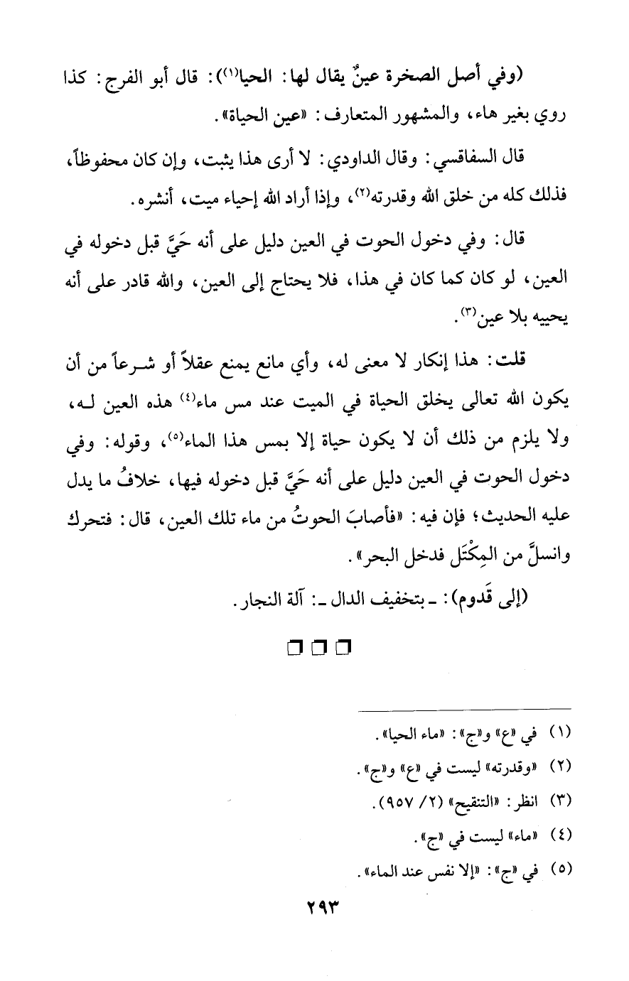 قلت: هذا إنكار لا معنى له، وأي مانع يمنع عقلًا أو شرعًا من أن يكون الله تعالى يخلق الحياة في الميت عند مس ماء (¬4) هذه العين له، ولا يلزم من ذلك أن لا يكون حياة إلا بمس هذا الماء (¬5)، وقوله: وفي دخول الحوت في العين دليل على أنه حَيَّ قبل دخوله فيها، خلافُ ما يدل عليه الحديث؛ فإن فيه: "فأصابَ الحوتُ من ماء تلك العين، قال: فتحرك وانسلَّ من المِكْتَل فدخل البحر".