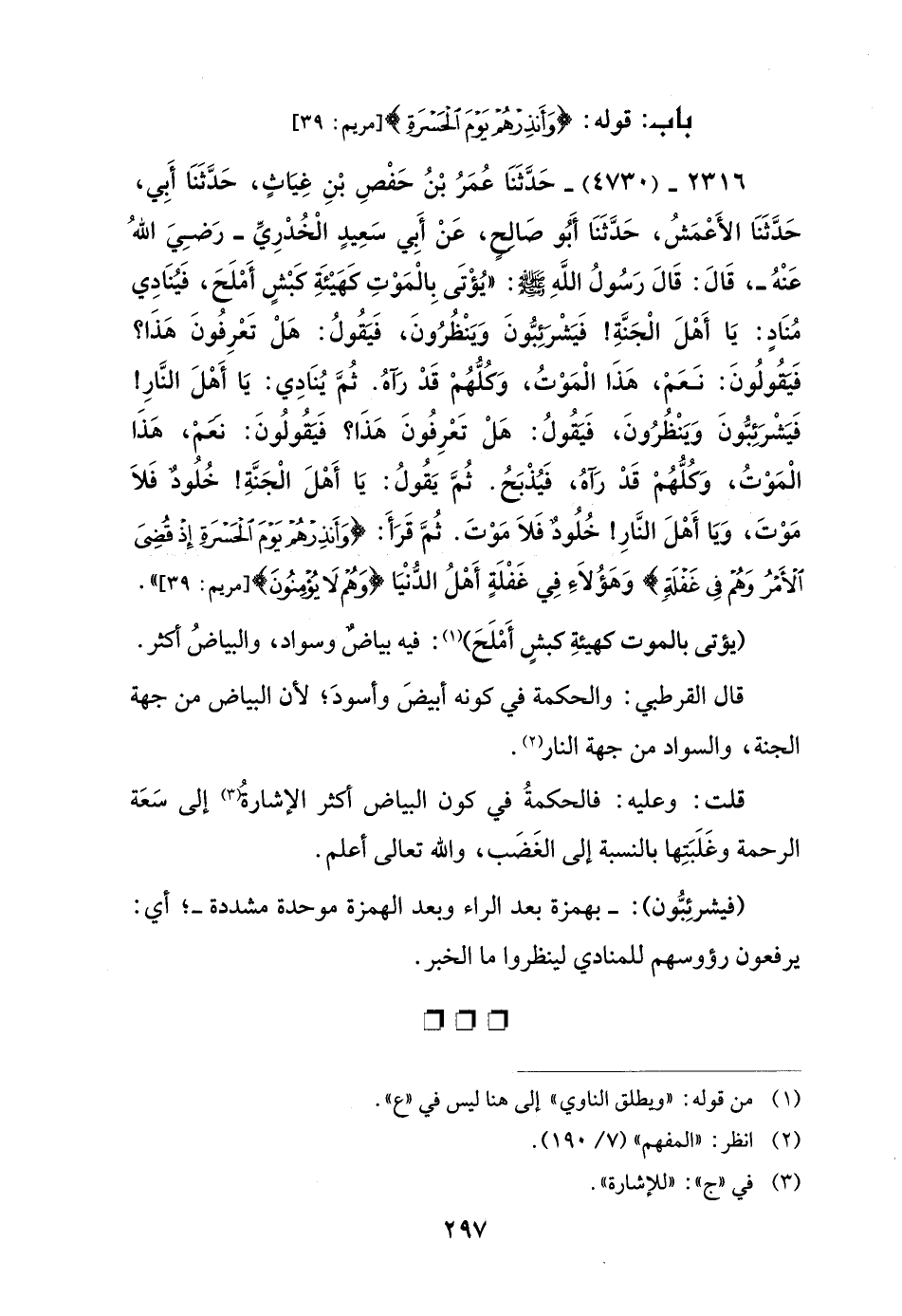 2316 - (4730) - حَدَّثَنَا عُمَرُ بْنُ حَفْصِ بْنِ غِيَاثٍ، حَدَّثَنَا أَبِي، حَدَّثَنَا الأَعْمَشُ، حَدَّثَنَا أَبُو صَالِحٍ، عَنْ أَبي سَعِيدٍ الْخُدْرِيِّ - رضي الله عنه -، قَالَ: قَالَ رَسُولُ اللَّهِ - صلى الله عليه وسلم -: "يُؤْتَى بِالْمَوْتِ كَهَيْئَةِ كَبْشٍ أَمْلَحَ، فَيُنَادِي مُنَادٍ: يَا أَهْلَ الْجَنَّةِ! فَيَشْرَئِبُّونَ وَيَنْظُرُونَ، فَيَقُولُ: هَلْ تَعْرِفونَ هَذَا؟ فَيَقُولُونَ: نَعَمْ، هَذَا الْمَوْتُ، وَكلُّهُمْ قَدْ رَآهُ. ثُمَّ يُنَادِي: يَا أَهْلَ النَّارِ! فَيَشْرَئِبُّونَ وَيَنْظُرُونَ، فَيَقُولُ: هَلْ تَعْرِفُونَ هَذَا؟ فَيَقُولُونَ: نَعَمْ، هَذا الْمَوْتُ، وَكلُّهُمْ قَدْ رَآهُ، فَيُذْبَحُ. ثُمَّ يَقُولُ: يَا أَهْلَ الْجَنَّةِ! خُلود فَلَا مَوْتَ، وَيَا أَهْلَ النَّارِ! خُلُودٌ فَلَا مَوْتَ. ثُمَّ قَرَأَ: {وَأَنْذِرْهُمْ يَوْمَ الْحَسْرَةِ إِذْ قُضِيَ الْأَمْرُ وَهُمْ فِي غَفْلَةٍ} [مريم: 39] وَهَؤُلَاءَ فِي غَفْلَةٍ أَهْلُ الدُّنْيَا {وَهُمْ لَا يُؤْمِنُونَ} [مريم: 39] ".