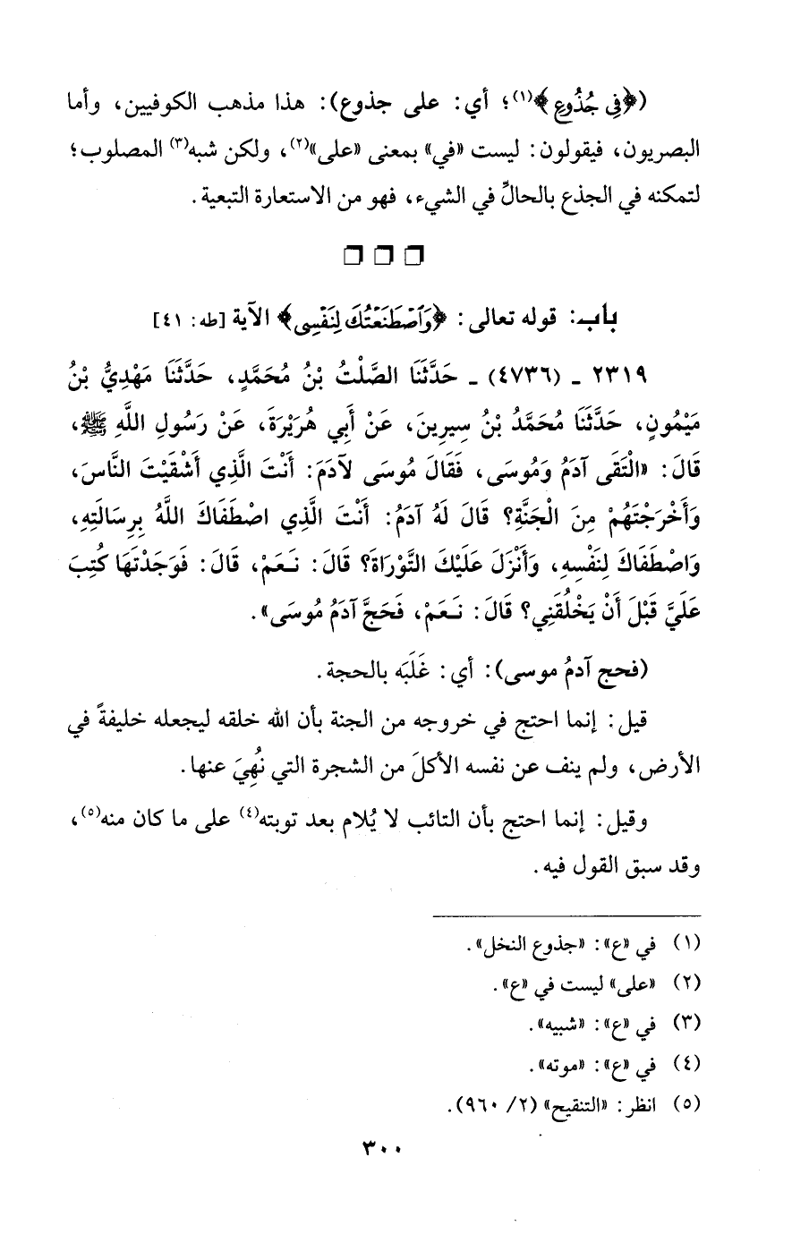 2319 - (4736) - حَدَّثَنَا الصَّلْتُ بْنُ مُحَمَّدٍ، حَدَّثَنَا مَهْدِيُّ بْنُ مَيْمُونٍ، حَدَّثَنَا مُحَمَّدُ بْنُ سيرِينَ، عَنْ أبي هُرَيْرَةَ، عَنْ رَسُولِ اللَّهِ - صلى الله عليه وسلم -، قَالَ: "الْتَقَى آدَمُ وَمُوسَى، فَقَالَ مُوسَى لآدَمَ: أَنْتَ الَّذِي أَشْقَيْتَ النَّاسَ، وَأَخْرَجْتَهُمْ مِنَ الْجَنَّةِ؟ قَالَ لَهُ آدَمُ: أَنْتَ الَّذِي اصْطَفَاكَ اللَّهُ بِرِسَالَتِهِ، وَاصْطَفَاكَ لِنَفْسِهِ، وَأَنْزَلَ عَلَيْكَ التَّوْرَاةَ؟ قَالَ: نَعَمْ، قَالَ: فَوَجَدْتَهَا كتِبَ عَلَيَّ قَبْلَ أَنْ يَخْلُقَنِي؟ قَالَ: نَعَمْ، فَحَجَّ آدَمُ مُوسَى".