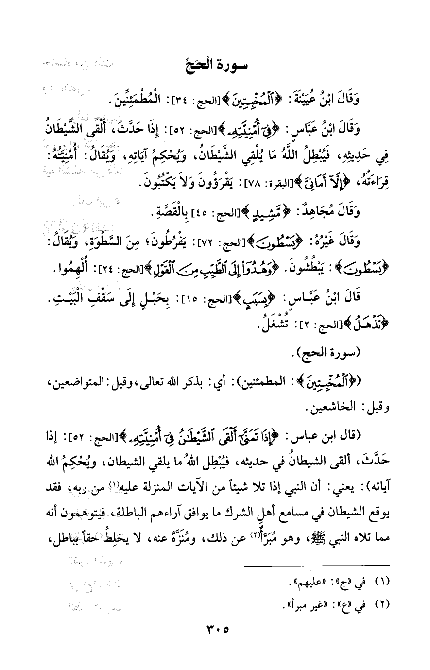 (قال ابن عباس: {إِذَا تَمَنَّى أَلْقَى الشَّيْطَانُ فِي أُمْنِيَّتِهِ} [الحج: 52]: إذا حَدَّثَ، ألقى الشيطانُ في حديثه، فيُبْطِل اللهُ ما يلقي الشيطان، ويُحْكِمُ الله آياته): يعني: أن النبي إذا تلا شيئًا من الآيات المنزلة عليه (¬1) من ربه، فقد يوقع الشيطان في مسامع أهلِ الشرك ما يوافق آراءهم الباطلة، فيتوهمون أنه مما تلاه النبي - صلى الله عليه وسلم -، وهو مُبَرَّأٌ (¬2) عن ذلك، ومُنَزَّهٌ عنه، لا يخلِطُ حقًا بباطل،