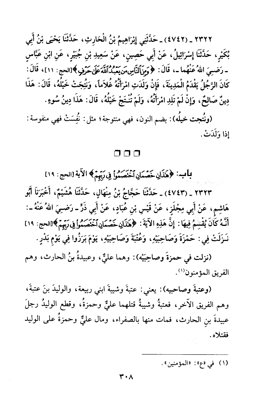 2323 - (4743) - حَدَّثَنَا حَجَّاجُ بْنُ مِنْهَالٍ، حَدَّثَنَا هُشَيْمٌ، أَخْبَرَنَا أَبُو هَاشِمٍ، عَنْ أَبي مِجْلَزٍ، عَنْ قَيْسِ بْنِ عُبَادٍ، عَنْ أَبِي ذَرٍّ - رضي الله عنه -: أَنَّهُ كانَ يُقْسمُ فِيهَا: إِنَّ هَذِهِ الآيَةَ. {هَذَانِ خَصْمَانِ اخْتَصَمُوا فِي رَبِّهِمْ} [الحج: 19] نَزَلَتْ فِي: حَمْزَةَ وَصَاحِبَيْهِ، وَعُتْبَةَ وَصَاحِبَيْهِ، يَوْمَ بَرَزُوا فِي يَوْمِ بَدْرٍ.