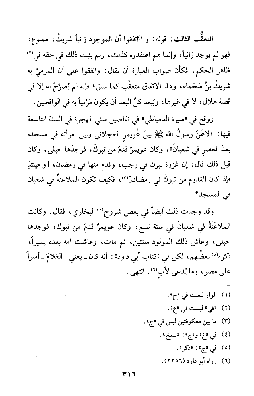 التعقُّب الثالث: قوله: و (¬1) اتفقوا أن الموجود زانيًا شريكٌ، ممنوع، فهو لم يوجد زانيًا، وإنما هم اعتقدوه كذلك، ولم يثبت ذلك في حقه في (¬2) ظاهر الحكم، فكأن صواب العبارة أن يقال: واتفقوا على أن المرميَّ به شريكُ بنُ سَحْماء، وهذا الاتفاق متعقَّب كما سبق؛ فإنه لم يُصرَّحْ به إلا في قصة هلال، لا في غيرها، ويَبعد كلَّ البعد أن يكون مَرْميًا به في الواقعتين.