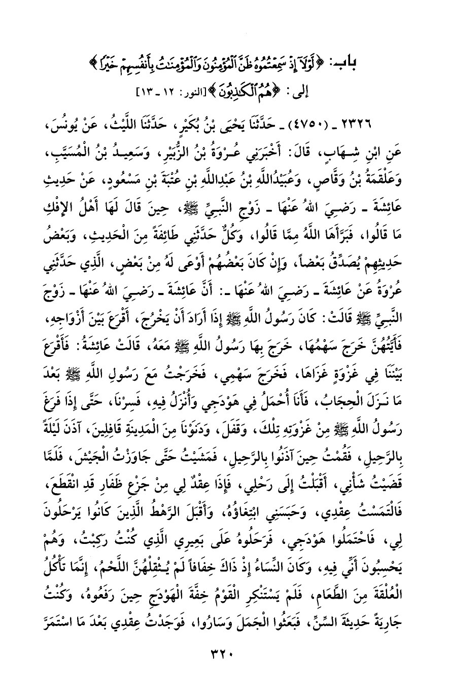 2326 - (4750) - حَدَّثَنَا يَحْيىَ بْنُ بُكَيْرٍ، حَدَّثَنَا اللَّيْثُ، عَنْ يُونُسَ، عَنِ ابْنِ شِهَابٍ، قَالَ: أَخْبَرَنِي عُرْوَةُ بْنُ الزُّبَيْرِ، وَسَعِيدُ بْنُ الْمُسَيَّبِ، وَعَلْقَمَةُ بْنُ وَقَّاصٍ، وَعُبَيْدُ اللَّهِ بْنُ عَبْدِ اللَّهِ بْنِ عُتْبَةَ بْنِ مَسْعُودٍ، عَنْ حَدِيثِ عَائِشَةَ -رَضِيَ اللهُ عَنْهَا- زَوْجِ النَّبِيِّ - صلى الله عليه وسلم -، حِينَ قَالَ لَهَا أَهْلُ الإفْكِ مَا قَالُوا، فَبَرَّأَهَا اللَّهُ مِمَّا قَالُوا، وَكُلٌّ حَدَّثَنِي طَائِفَةً مِنَ الْحَدِيثِ، وَبَعْضُ حَدِيثهِمْ يُصَدِّقُ بَعْضًا، وَإِنْ كَانَ بَعْضُهُمْ أَوْعَى لَهُ مِنْ بَعْضٍ، الَّذِي حَدَّثَنِي عُرْوَةُ عَنْ عَائِشَةَ -رَضِيَ اللهُ عَنْهَا-: أَنَّ عَائِشَةَ -رَضِيَ اللهُ عَنْهَا- زَوْجَ النَّبِيِّ - صلى الله عليه وسلم - قَالَتْ: كَانَ رَسُولُ اللَّهِ - صلى الله عليه وسلم - إِذَا أَرَادَ أَنْ يَخْرُجَ، أَقْرَعَ بَيْنَ أَزْوَاجِهِ، فَأَيَّتُهُنَّ خَرَجَ سَهْمُهَا، خَرَجَ بِهَا رَسُولُ اللَّهِ - صلى الله عليه وسلم - مَعَهُ، قَالَتْ عَائِشَةُ: فَأَقْرعَ بَيْنَنَا فِي غَزْوَةٍ غَزَاهَا، فَخَرَجَ سَهْمِي، فَخَرَجْتُ مَعَ رَسُولِ اللَّهِ - صلى الله عليه وسلم - بَعْدَ مَا نَزَلَ الْحِجَابُ، فَأَنَا أُحمَلُ فِي هَوْدَجِي وَأُنْزَلُ فِيهِ، فَسِرْنَا، حَتَّى إِذَا فَرَغَ رَسُولُ اللَّهِ - صلى الله عليه وسلم - مِنْ غَزْوَتهِ تِلْكَ، وَقَفَلَ، وَدَنَوْنَا مِنَ الْمَدِينَةِ قَافِلِينَ، آذَنَ لَيْلَةً بِالرَّحِيلِ، فَقُمْتُ حِينَ آذَنُوا بِالرَّحِيلِ، فَمَشَيْتُ حَتَّى جَاوَزْتُ الْجَيْشَ، فَلَمَّا قَضَيْتُ شَأْنِي، أَقْبَلْتُ إِلَى رَحْلِي، فَإِذَا عِقْدٌ لِي مِنْ جَزْعِ ظَفَارِ قَدِ انْقَطَعَ، فَالْتَمَسْتُ عِقْدِي، وَحَبَسَنِي ابْتِغَاؤُهُ، وَأَقْبَلَ الرَّهْطُ الَّذِينَ كَانُوا يَرْحَلُونَ لِي، فَاحْتَمَلُوا هَوْدَجِي، فَرَحَلُوهُ عَلَى بَعِيرِي الَّذِي كنْتُ رَكِبْتُ، وَهُمْ يَحْسِبُونَ أَنِّي فِيهِ، وَكَانَ النِّسَاءُ إِذْ ذَاكَ خِفَافًا لَمْ يُثْقِلْهُنَّ اللَّحْمُ، إِنَّمَا تَأْكُلُ الْعُلْقَةَ مِنَ الطَّعَامِ، فَلَمْ يَسْتَنْكِرِ الْقَوْمُ خِفَّةَ الْهَوْدجَ حِينَ رَفَعُوهُ، وَكنْتُ جَارِيَةً حَدِيثَةَ السِّنِّ، فَبَعَثُوا الْجَمَلَ وَسَارُوا، فَوَجَدْتُ عِقْدِي بَعْدَ مَا اسْتَمَرَّ