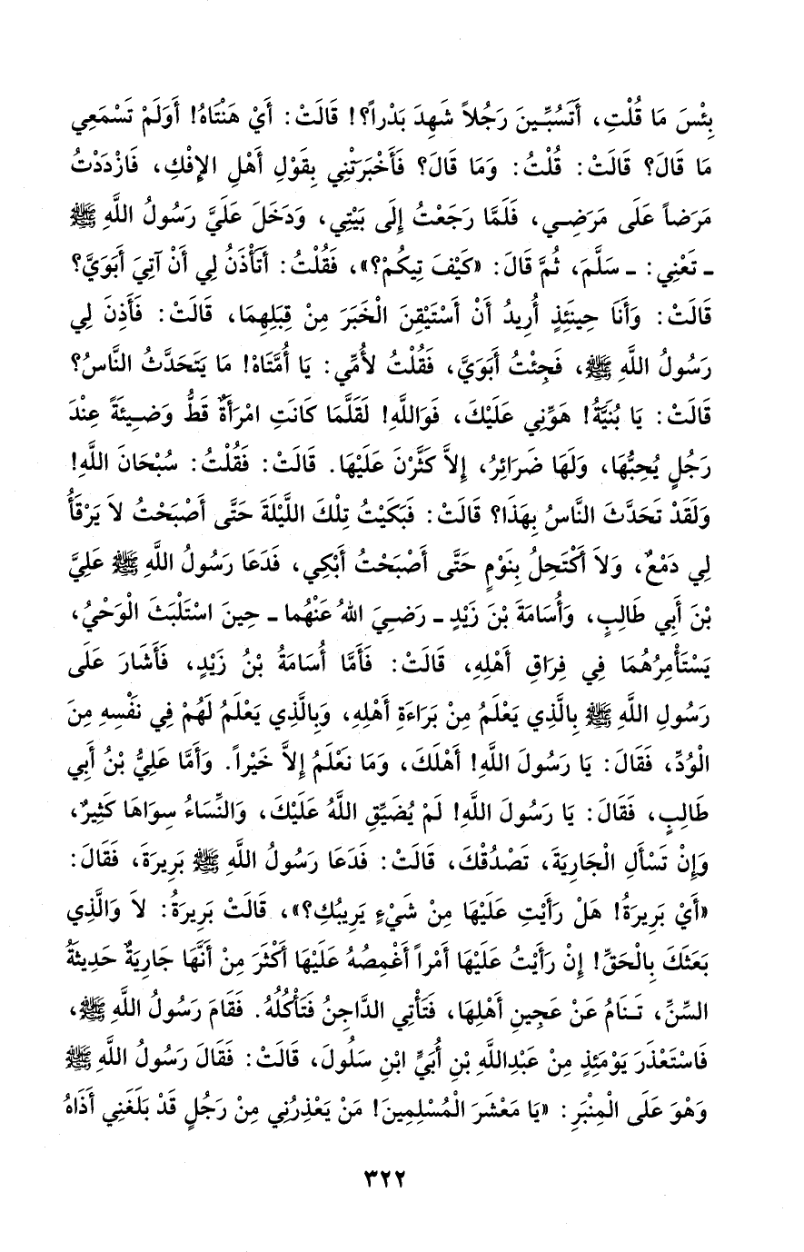 بِئْسَ مَا قُلْتِ، أتسُبِّينَ رَجُلًا شَهِدَ بَدْرًا؟! قَالَتْ: أَيْ هَنتاهُ! أَوَ لَمْ تَسْمَعِي مَا قَالَ؟ قَالَتْ: قُلْتُ: وَمَا قَالَ؟ فَأَخْبَرَتْنِي بِقَوْلِ أَهْلِ الإفْكِ، فَازْدَدْتُ مَرَضًا عَلَى مَرَضِي، فَلَمَّا رَجَعْتُ إِلَى بَيْتِي، وَدَخَلَ عَلَيَّ رَسُولُ اللَّهِ - صلى الله عليه وسلم - -تَعْنِي:- سَلَّمَ، ثُمَّ قَالَ: "كيْفَ تِيكُمْ؟ "، فَقُلْتُ: أَتَأْذَنُ لِي أَنْ آتِيَ أَبَوَيَّ؟ قَالَتْ: وَأَنَا حِينَئِذٍ أُرِيدُ أَنْ أَسْتَيْقِنَ الْخَبَرَ مِنْ قِبَلِهِمَا، قَالَتْ: فَأَذِنَ لِي رَسُولُ اللَّهِ - صلى الله عليه وسلم -، فَجئْتُ أَبَوَيَّ، فَقُلْتُ لأُمِّي: يَا أُمَّتَاهْ! مَا يَتَحَدَّثُ النَّاسُ؟ قَالَتْ: يَا بُنَيَّةُ! هَوِّنِي عَلَيْكَ، فَوَاللَّهِ! لَقَلَّمَا كَانَتِ امْرَأةٌ قَطُّ وَضِيئَةً عِنْدَ رَجُلٍ يُحِبُّهَا، وَلَهَا ضَرَائِرُ، إِلَّا كَثَّرْنَ عَلَيْهَا. قَالَتْ: فَقُلْتُ: سُبْحَانَ اللَّهِ! وَلَقَدْ تَحَدَّثَ النَّاسُ بِهَذَا؟ قَالَتْ: فَبَكَيْتُ تِلْكَ اللَّيْلَةَ حَتَى أَصْبَحْتُ لَا يَرْقَأُ لِي دَمْعٌ، وَلَا أكتَحِلُ بِنَوْمٍ حَتَّى أَصْبَحْتُ أَبْكِي، فَدَعَا رَسُولُ اللَّهِ - صلى الله عليه وسلم - عَلِيَّ بْنَ أَبي طَالِبٍ، وَأُسُامَةَ بْنَ زيدٍ -رَضِيَ اللهُ عَنْهُما- حِينَ اسْتَلْبَثَ الْوَحْيُ، يَسْتَأْمِرُهُمَا فِي فِرَاقِ أَهْلِهِ، قَالَتْ: فَأَمَّا أُسَامَةُ بْنُ زيدٍ، فَأَشَارَ عَلَى رَسُولِ اللَّهِ - صلى الله عليه وسلم - بِالَّذِي يَعْلَمُ مِنْ بَرَاءَةِ أَهْلِهِ، وَبِالَّذِي يَعْلَمُ لَهُمْ فِي نَفْسِهِ مِنَ الْوُدِّ، فَقَالَ: يَا رَسُولَ اللَّهِ! أَهْلَكَ، وَمَا نَعْلَمُ إِلَّا خَيْرًا. وَأَمَّا عَلِيُّ بْنُ أَبي طَالِبٍ، فَقَالَ: يَا رَسُولَ اللَّهِ! لَمْ يُضَيِّقِ اللَّهُ عَلَيْكَ، وَالنِّسَاءُ سِوَاهَا كَثِيرٌ، وَإِنْ تَسْأَلِ الْجَارِيةَ، تَصْدُقْكَ، قَالَتْ: فَدَعَا رَسُولُ اللَّهِ - صلى الله عليه وسلم - بَرِيرَةَ، فَقَالَ: "أَيْ بَرِيرَةُ! هَلْ رَأَيْتِ عَلَيْهَا مِنْ شَيْءٍ يَرِيبُكِ؟ "، قَالَتْ بَرِيرَةُ: لَا وَالَّذِي بَعَثَكَ بِالْحَقِّ! إِنْ رَأَيْتُ عَلَيْهَا أَمْرًا أَغْمِصُهُ عَلَيْهَا أَكثَرَ مِنْ أَنَّهَا جَارِيةٌ حَدِيثَةُ السِّنِّ، تَنَامُ عَنْ عَجينِ أَهْلِهَا، فتأْتِي الدَّاجِنُ فَتَأْكُلُهُ. فَقَامَ رَسُولُ اللَّهِ - صلى الله عليه وسلم -، فَاسْتَعْذَرَ يَوْمَئِذٍ مِنْ عَبْدِ اللَّهِ بْنِ أُبَيٍّ ابْنِ سَلُولَ، قَالَتْ: فَقَالَ رَسُولُ اللَّهِ - صلى الله عليه وسلم - وَهْوَ عَلَى الْمِنْبَرِ: "يَا مَعْشَرَ الْمُسْلِمِينَ! مَنْ يَعْذِرُنِي مِنْ رَجُلٍ قَدْ بَلَغَنِي أَذَاهُ