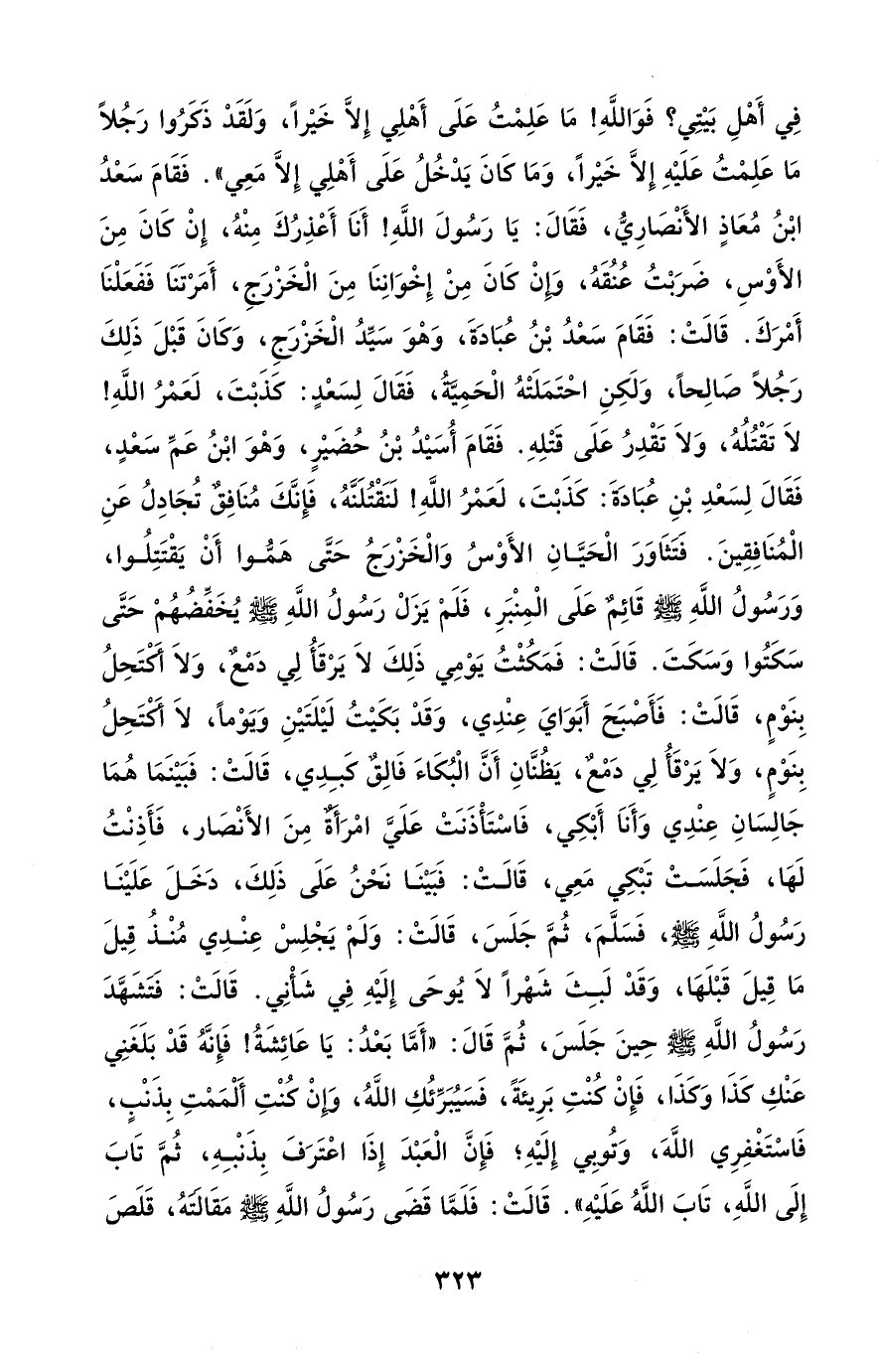 فِي أَهْلِ بَيْتِي؟ فَوَاللَّهِ! مَا عَلِمْتُ عَلَى أَهْلِي إِلَّا خَيْرًا، وَلَقَدْ ذَكَرُوا رَجُلًا مَا عَلِمْتُ عَلَيْهِ إلَّا خَيْرًا، وَمَا كَانَ يَدْخُلُ عَلَى أَهْلِي إِلَّا مَعِي". فَقَامَ سَعْدُ ابْنُ مُعَاذٍ الأَنْصَارِيُّ، فَقَالَ: يَا رَسُولَ اللَّهِ! أَنَا أَعْذِرُكَ مِنْهُ، إِنْ كَانَ مِنَ الأَوْسِ، ضَرَبْتُ عُنُقَهُ، وَإِنْ كَانَ مِنْ إِخْوَانِنَا مِنَ الْخَزْرجَ، أَمَرْتَنَا فَفَعَلْنَا أَمْرَكَ. قَالَتْ: فَقَامَ سَعْدُ بْنُ عُبَادَةَ، وَهْوَ سَيِّدُ الْخَزْرَجِ، وَكَانَ قَبْلَ ذَلِكَ رَجُلًا صَالِحًا، وَلَكِنِ احْتَمَلَتْهُ الْحَمِيَّةُ، فَقَالَ لِسَعْدٍ: كَذَبْتَ، لَعَمْرُ اللَّهِ! لَا تَقْتُلُهُ، وَلَا تَقْدِرُ عَلَى قَتْلِهِ. فَقَامَ أُسَيْدُ بْنُ حُضَيْرٍ، وَهْوَ ابْنُ عَمِّ سَعْدٍ، فَقَالَ لِسَعْدِ بْنِ عُبَادَةَ: كَذَبْتَ، لَعَمْرُ اللَّهِ! لَنَقْتُلَنَّهُ، فَإِنَّكَ مُنَافِقٌ تُجَادِلُ عَنِ الْمُنَافِقِينَ. فتثَاوَرَ الْحَيَّانِ الأَوْسُ وَالْخَزْرجُ حَتَّى هَمُّوا أَنْ يَقْتَتِلُوا، وَرَسُولُ اللَّهِ - صلى الله عليه وسلم - قَائِمٌ عَلَى الْمِنْبَرِ، فَلَمْ يَزَلْ رَسُولُ اللَّهِ - صلى الله عليه وسلم - يُخَفِّضُهُمْ حَتَّى سَكَتُوا وَسَكَتَ. قَالَتْ: فَمَكُثْتُ يَوْمِي ذَلِكَ لَا يَرْقَأُ لِي دَمْع، وَلَا أَكْتَحِلُ بِنَوْمٍ، قَالَتْ: فَأَصْبَحَ أَبَوَايَ عِنْدِي، وَقَدْ بَكَيْتُ لَيْلَتَيْنِ وَيَوْمًا، لَا أَكْتَحِلُ بِنَوْمٍ، وَلَا يَرْقَأُ لِي دَمْع، يَظُنَّانِ أَنَّ الْبُكَاءَ فَالِقٌ كبِدِي، قَالَتْ: فَبَيْنَمَا هُمَا جَالِسَانِ عِنْدِي وَأَنَا أَبْكِي، فَاسْتَأْذَنَتْ عَلَيَّ امْرَأةٌ مِنَ الأَنْصَار، فَأَذِنْتُ لَهَا، فَجَلَسَتْ تَبْكِي مَعِي، قَالَتْ: فَبَيْنَا نَحْنُ عَلَى ذَلِكَ، دَخَلَ عَلَيْنَا رَسُولُ اللَّهِ - صلى الله عليه وسلم -، فَسَلَّمَ، ثُمَّ جَلَسَ، قَالَتْ: وَلَمْ يَجْلِسْ عِنْدِي مُنْذُ قِيلَ مَا قِيلَ قَبْلَهَا، وَقَدْ لَبِثَ شَهْرًا لَا يُوحَى إِلَيْهِ فِي شَأْنِي. قَالَتْ: فتَشَهَّدَ رَسُولُ اللَّهِ - صلى الله عليه وسلم - حِينَ جَلَسَ، ثُمَّ قَالَ: "أَمَّا بَعْدُ: يَا عَائِشَةُ! فَإِنَّهُ قَدْ بَلَغَنِي عَنْكِ كَذَا وَكَذَا، فَإِنْ كُنْتِ بَرِيئَةً، فَسَيُبَرِّئُكِ اللَّهُ، وَإِنْ كُنْتِ أَلْمَمْتِ بِذَنْبٍ، فَاسْتَغْفِرِي اللَّهَ، وَتُوبِي إِلَيْهِ؛ فَإِنَّ الْعَبْدَ إِذَا اعْتَرَفَ بِذَنْبِهِ، ثُمَّ تَابَ إِلَى اللَّهِ، تَابَ اللَّهُ عَلَيْهِ". قَالَتْ: فَلَمَّا قَضَى رَسُولُ اللَّهِ - صلى الله عليه وسلم - مَقَالتَهُ، قَلَصَ