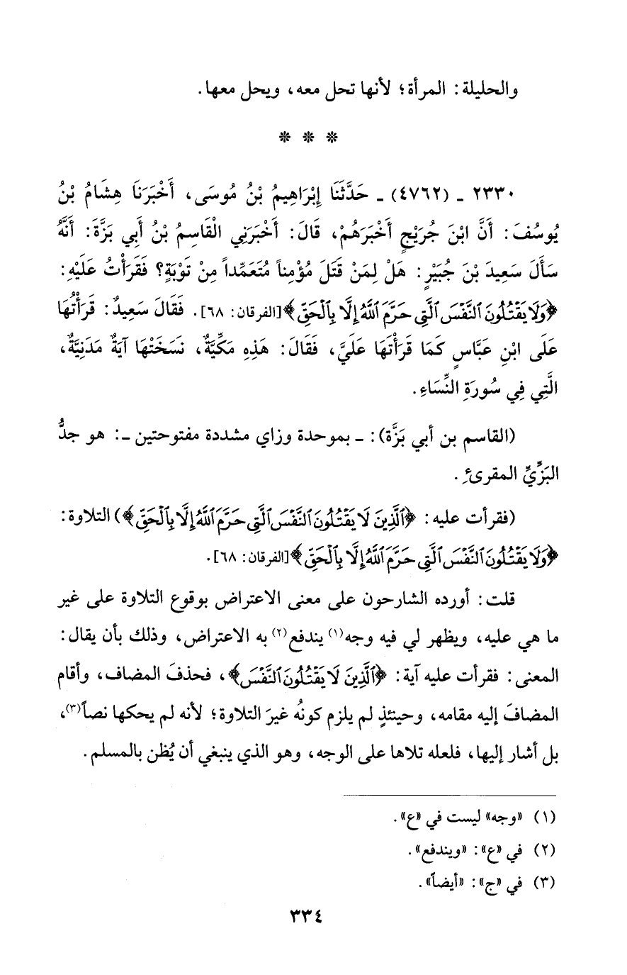 2330 - (4762) - حَدَّثَنَا إِبْرَاهِيمُ بْنُ مُوسَى، أَخْبَرَنَا هِشَامُ بْنُ يُوسُفَ: أَنَّ ابْنَ جُرَيْجٍ أَخْبَرَهُمْ، قَالَ: أَخْبَرَنِي الْقَاسِمُ بْنُ أَبي بَزَّةَ: أَنَّهُ سَأَلَ سَعِيدَ بْنَ جُبَيْرٍ: هَلْ لِمَنْ قتلَ مُؤْمِنًا مُتَعَمِّدًا مِنْ تَوْبَةٍ؟ فَقَرَأْتُ عَلَيْهِ: {وَلَا يَقْتُلُونَ النَّفْسَ الَّتِي حَرَّمَ اللَّهُ إِلَّا بِالْحَقِّ} [الفرقان: 68]. فَقَالَ سَعِيدٌ: قَرَأْتُهَا عَلَى ابْنِ عَبَّاسٍ كَمَا قَرَأْتَهَا عَلَيَّ، فَقَالَ: هَذه مَكِّيَّةٌ، نسًخَتْهَا آيَة مَدَنِيَّةٌ، الَّتِي فِي سُورَةِ النِّسَاء.