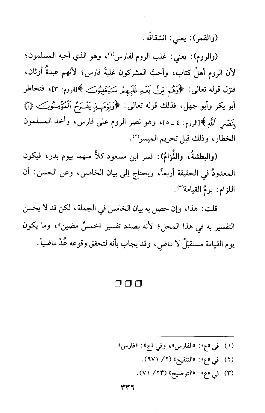 (والروم): يعني: غلب الروم لفارس (¬1)، وهو الذي أحبه المسلمون؛ لأن الروم أهلُ كتاب، وأحبَّ المشركون غلبةَ فارس؛ لأنهم عبدةُ أوثان، فنزل قوله تعالى: {وَهُمْ مِنْ بَعْدِ غَلَبِهِمْ سَيَغْلِبُونَ} [الروم: 3]، فتخاطر أبو بكر وأبو جهل، فذلك قوله تعالى: {وَيَوْمَئِذٍ يَفْرَحُ الْمُؤْمِنُونَ (4) بِنَصْرِ اللَّهِ} [الروم: 4 - 5]، وهو نصر الروم على فارس، وأخذ المسلمون الخطار، وذلك قبل تحريم الميسر (¬2).