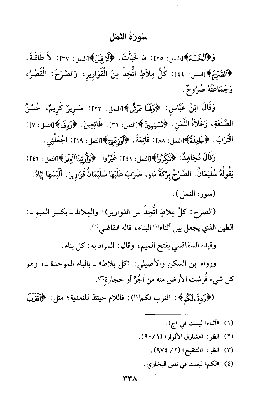 (الصرح: كلُّ مِلاطٍ اتُّخِذَ من القوارير): والمِلاط -بكسر الميم-: الطين الذي يجعل بين أثناء (¬1) البناء، قاله القاضي (¬2).