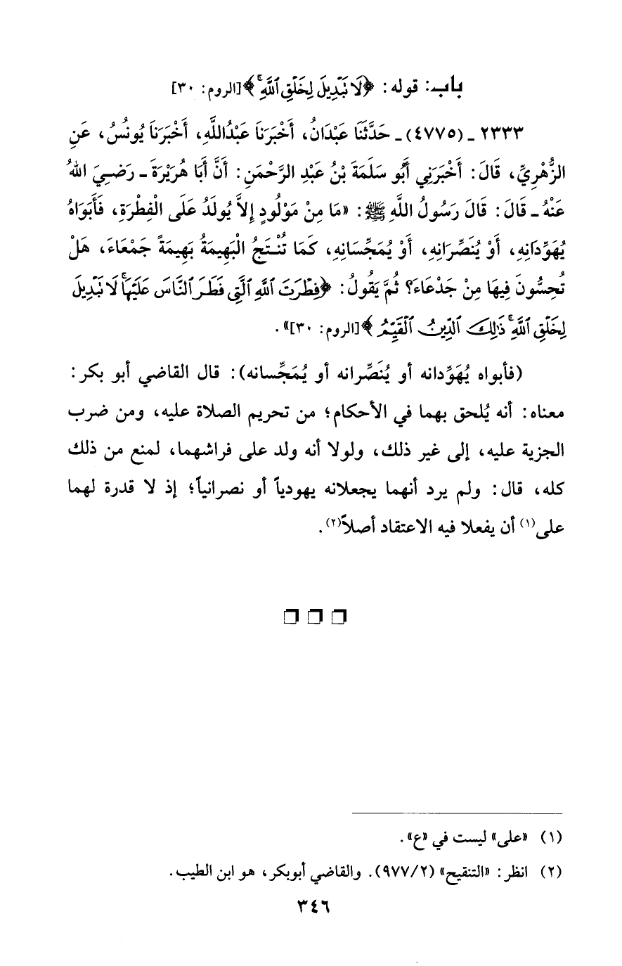 2333 - (4775) - حَدَّثَنَا عَبْدَانُ، أَخْبَرَنَا عَبْدُ اللَّهِ، أَخْبَرَنَا يُونُسُ، عَنِ الزُّهْرِيِّ، قَالَ: أَخْبَرَنِي أَبُو سَلَمَةَ بْنُ عَبْدِ الرَّحْمَنِ: أَنَّ أَبَا هُرَيْرَةَ - رضي الله عنه - قَالَ: قَالَ رَسُولُ اللَّهِ - صلى الله عليه وسلم -: "مَا مِنْ مَوْلُودٍ إِلَّا يُولَدُ عَلَى الْفِطْرَةِ، فَأَبَوَاهُ يُهَوِّدَانِهِ، أَوْ يُنَصِّرَانِهِ، أَوْ يُمَجِّسَانِهِ، كَمَا تُنْتَجُ الْبَهِيمَةُ بَهِيمَةً جَمْعَاءَ، هَلْ تُحِسُّونَ فِيهَا مِنْ جَدْعَاءَ؟ ثُمَّ يَقُولُ: {فَأَقِمْ وَجْهَكَ لِلدِّينِ حَنِيفًا فِطْرَتَ اللَّهِ الَّتِي فَطَرَ النَّاسَ عَلَيْهَا لَا تَبْدِيلَ لِخَلْقِ اللَّهِ ذَلِكَ الدِّينُ الْقَيِّمُ} [الروم: 30] ".