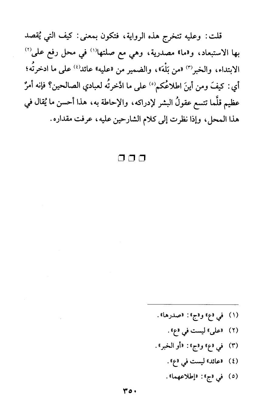 قلت: وعليه تتخرج هذه الرواية، فتكون بمعنى: كيف التي يُقصد بها الاستبعاد، و"ما" مصدرية، وهي مع صلتها (¬1) في محل رفع على (¬2) الابتداء، والخبر (¬3) "من بَلْهَ"، والضمير من "عليه" عائد (¬4) على ما ادخرتُه؛ أي: كيفَ ومن أينَ اطلاعُكم (¬5) على ما ادَّخرتُه لعبادي الصالحين؟ فإنه أمرٌ عظيم قلَّما تتسع عقولُ البشر لإدراكه، والإحاطة به، هذا أحسن ما يُقال في هذا المحل، وإذا نظرت إلى كلام الشارحين عليه، عرفت مقداره.