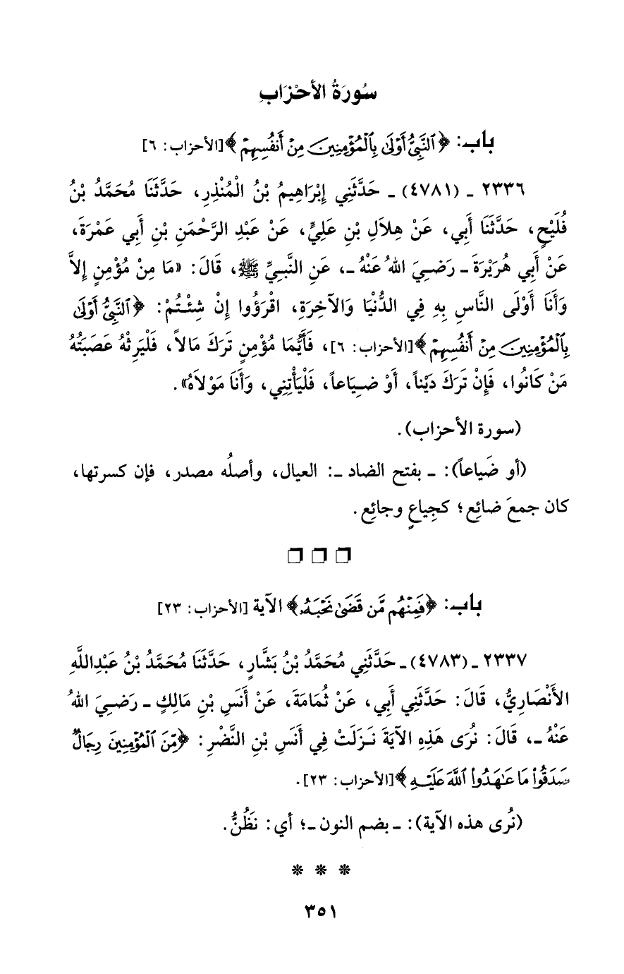 2336 - (4781) - حَدَّثَنِي إِبْرَاهِيمُ بْنُ الْمُنْذِرِ، حَدَّثَنَا مُحَمَّدُ بْنُ فُلَيْحٍ، حَدَّثَنَا أَبِي، عَنْ هِلَالِ بْنِ عَلِيِّ، عَنْ عَبْدِ الرَّحْمَنِ بْنِ أَبي عَمْرَةَ، عَنْ أَبِي هُرَيْرَة - رضي الله عنه -، عَنِ النَّبِيِّ - صلى الله عليه وسلم -، قَالَ: "مَا مِنْ مُؤْمِنٍ إِلَّا وَأَنَا أَوْلَى النَّاسِ بِهِ فِي الدُّنْيَا وَالآخِرَةِ، اقْرَؤُوا إِنْ شِئْتُمْ: {النَّبِيُّ أَوْلَى بِالْمُؤْمِنِينَ مِنْ أَنْفُسِهِمْ} [الأحزاب: 6]، فَأَيُّمَا مُؤْمِنٍ تَرَكَ مَالًا، فَلْيَرِثْهُ عَصَبَتُهُ مَنْ كَانُوا، فَإِنْ تَرَكَ دَيْنًا، أَوْ ضِيَاعًا، فَلْيَأْتِنِي، وَأَنَا مَوْلَاهُ".