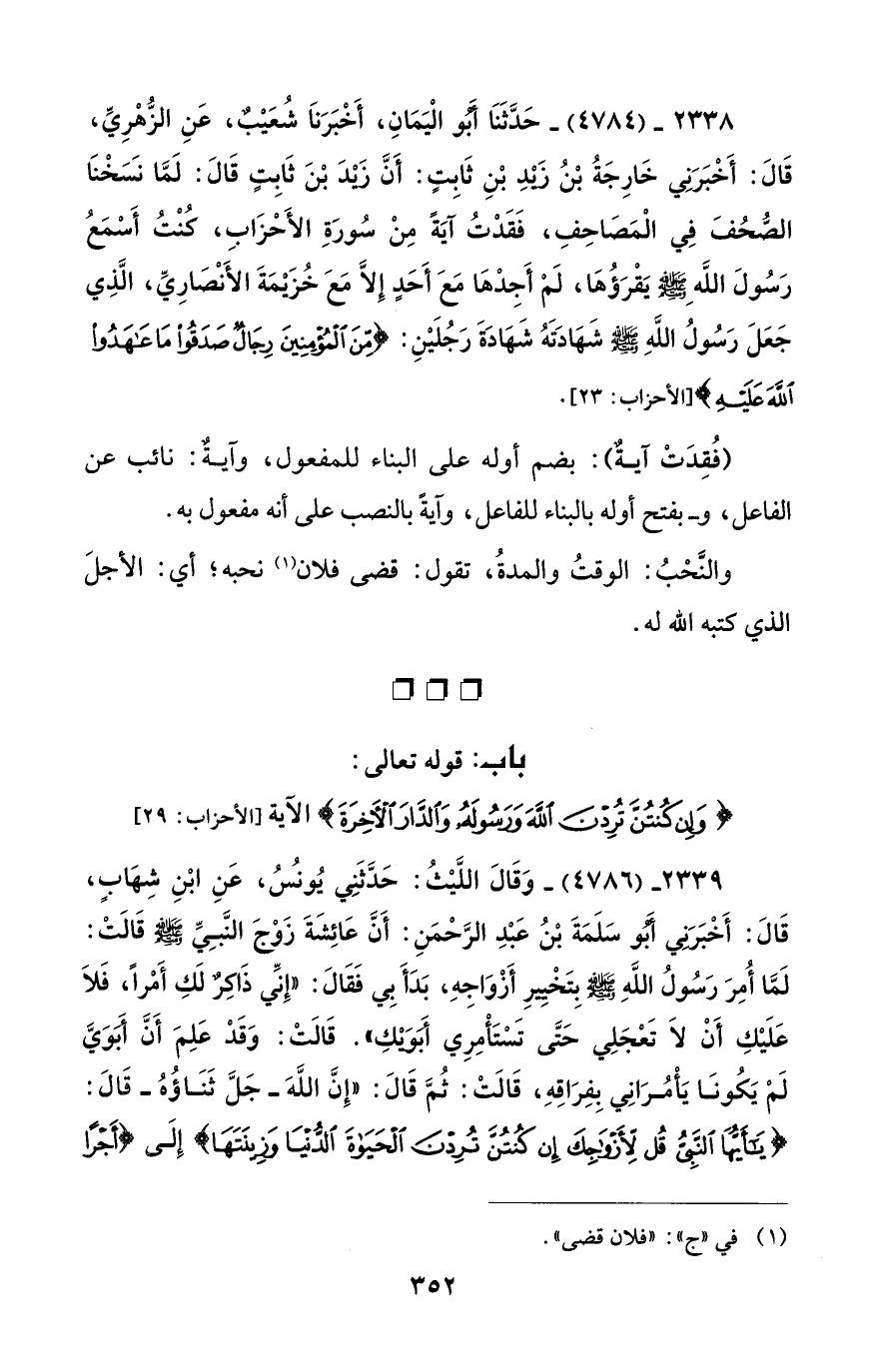 2338 - (4784) - حَدَّثَنَا أَبُو الْيَمَانِ، أَخْبَرَنَا شُعَيْبٌ، عَنِ الزُّهْرِيِّ، قَالَ: أَخْبَرَنِي خَارِجَةُ بْنُ زيدِ بْنِ ثَابِتٍ: أَنَّ زيدَ بْنَ ثَابِتٍ قَالَ: لَمَّا نسخْنَا الصُّحُفَ فِي الْمَصَاحِفِ، فَقَدْتُ آيَةً مِنْ سُورَةِ الأَحْزَابِ، كنْتُ أَسْمَعُ رَسُولَ اللَّه - صلى الله عليه وسلم - يَقْرَؤُهَا، لَمْ أَجِدْهَا مَعَ أَحَدٍ إِلأَ مَعَ خُزَيْمَةَ الأَنْصَارِيِّ، الَّذِي جَعَلَ رَسُولُ اللَّهِ - صلى الله عليه وسلم - شَهَادَتَهُ شَهَادَةَ رَجُلَيْنِ: {مِنَ الْمُؤْمِنِينَ رِجَالٌ صَدَقُوا مَا عَاهَدُوا اللَّهَ عَلَيْهِ} [الأحزاب: 23].