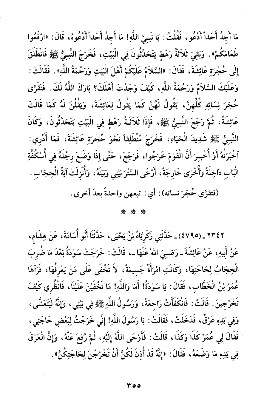 2342 - (4795) - حَدَّثَنِي زَكَرِيَّاءُ بْنُ يَحْيَى، حَدَّثَنَا أَبُو أُسَامَةَ، عَنْ هِشَامٍ، عَنْ أَبيهِ، عَنْ عَائِشَةَ -رَضِيَ اللهُ عَنْهَا-، قَالَتْ: خَرَجَتْ سَوْدَةُ بَعْدَ مَا ضُرِبَ الْحِجَابُ لِحَاجَتِهَا، وكَانَتِ امْرَأَةً جَسِيمَةً، لَا تَخْفَى عَلَى مَنْ يَعْرِفُهَا، فَرَآهَا عُمَرُ بْنُ الْخَطَّابِ، فَقَالَ: يَا سَوْدَةُ! أَمَا وَاللَّهِ! مَا تَخْفَيْنَ عَلَيْنَا، فَانْظُرِي كَيْفَ تَخْرُجِينَ. قَالَتْ: فَانْكَفَأَتْ رَاجِعَةً، وَرَسُولُ اللَّهِ - صلى الله عليه وسلم - فِي بَيْتِي، وَإِنَّهُ لَيَتعَشَّى، وَفِي يَدِهِ عَرْقٌ، فَدَخَلَتْ، فَقَالَتْ: يَا رَسُولَ اللَّهِ! إِنِّي خَرَجْتُ لِبَعْضِ حَاجَتِي، فَقَالَ لِي عُمَرُ كَذَا وَكَذَا، قَالَتْ: فَأَوْحَى اللَّهُ إِلَيْهِ، ثُمَّ رُفِعَ عَنْهُ، وَإِنَّ الْعَرْقَ فِي يَدِهِ مَا وَضَعَهُ، فَقَالَ: "إِنَّهُ قَدْ أُذِنَ لَكُنَّ أَنْ تَخْرُجْنَ لِحَاجَتِكُنَّ".