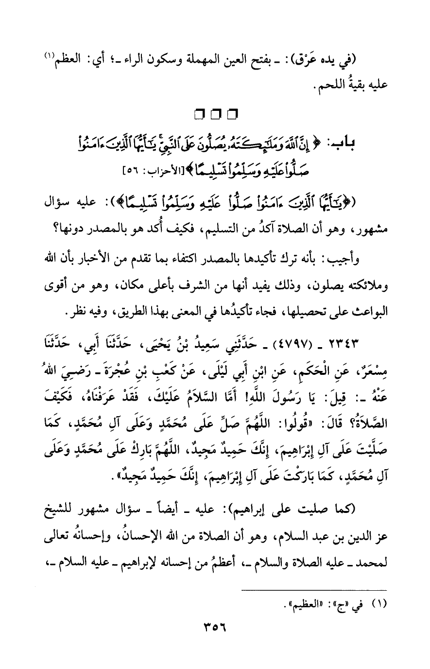 باب: {إِنَّ اللَّهَ وَمَلَائِكَتَهُ يُصَلُّونَ عَلَى النَّبِيِّ يَاأَيُّهَا الَّذِينَ آمَنُوا صَلُّوا عَلَيْهِ وَسَلِّمُوا تَسْلِيمًا} [الأحزاب: 56]
