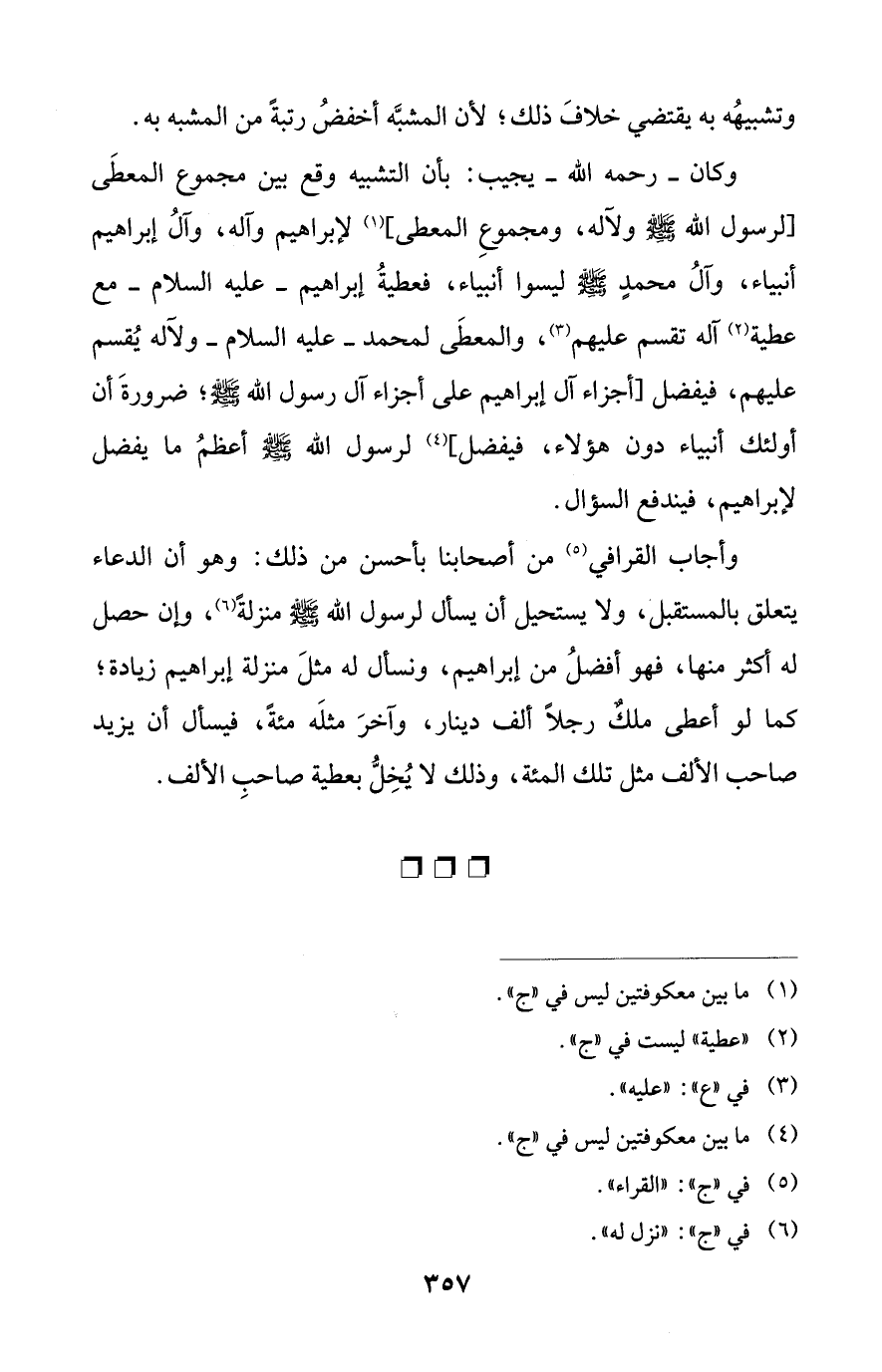 وكان -رحمه الله- يجيب: بأن التشبيه وقع بين مجموع المعطَى [لرسول الله - صلى الله عليه وسلم - ولآله، ومجموعِ المعطى] (¬1) لإبراهيم وآله، وآلُ إبراهيم أنبياء، وآلُ محمدٍ - صلى الله عليه وسلم - ليسوا أنبياء، فعطيةُ إبراهيم -عليه السلام- مع عطية (¬2) آله تقسم عليهم (¬3)، والمعطَى لمحمد -عليه السلام- ولآله يُقسم عليهم، فيفضل [أجزاء آل إبراهيم على أجزاء آل رسول الله - صلى الله عليه وسلم -؛ ضرورةَ أن أولئك أنبياء دون هؤلاء، فيفضل] (¬4) لرسول الله - صلى الله عليه وسلم - أعظمُ ما يفضل لإبراهيم، فيندفع السؤال.