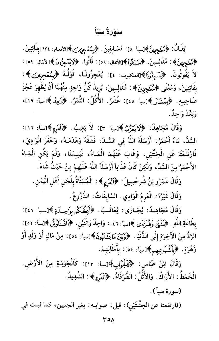 وَقَالَ مُجَاهِدٌ: {لَا يَعْزُبُ} [سبأ: 3]: لَا يَغِيبُ. {الْعَرِمِ} [سبأ: 16]: السُّدُّ، مَاءٌ أَحْمَرُ، أَرْسَلَهُ اللَّهُ فِي السُّدِّ، فَشَقَّهُ وَهَدَمَهُ، وَحَفَرَ الْوَادِيَ، فَارْتَفَعَتَا عَنِ الْجَنَّتَيْنِ، وَغَابَ عَنْهُمَا الْمَاءُ، فَيَبِسَتَا، وَلَمْ يَكُنِ الْمَاءُ الأَحْمَرُ مِنَ السُّدِّ، وَلَكِنْ كَانَ عَذَابًا أَرْسَلَهُ اللَّهُ عَلَيْهِمْ مِنْ حَيْث شَاءَ.