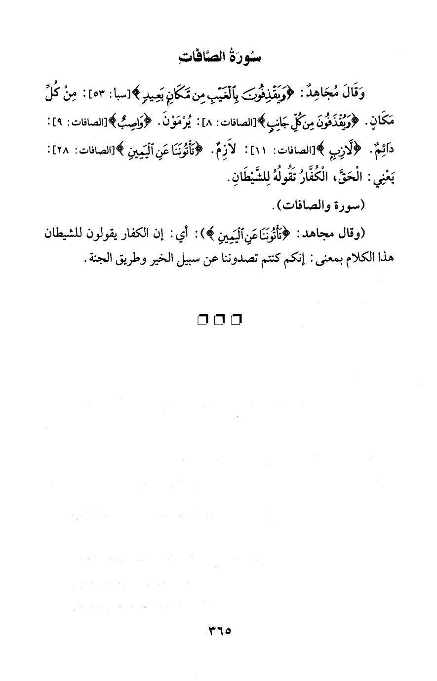 وَقَالَ مُجَاهِدٌ: {وَيَقْذِفُونَ بِالْغَيْبِ مِنْ مَكَانٍ بَعِيدٍ} [سبأ: 53]: مِنْ كُلِّ مَكَانٍ. {وَيُقْذَفُونَ مِنْ كُلِّ جَانِبٍ} [الصافات: 8]: يُرْمَوْنَ. {وَاصِبٌ} [الصافات: 9]: دَائِمٌ. {لَازِبٍ} [الصافات: 11]: لَازِمٌ. {تَأْتُونَنَا عَنِ الْيَمِينِ} [الصافات: 28]: يَعْنِي: الْحَقَّ، الْكُفَّارُ تَقُولُهُ لِلشَّيْطَانِ.