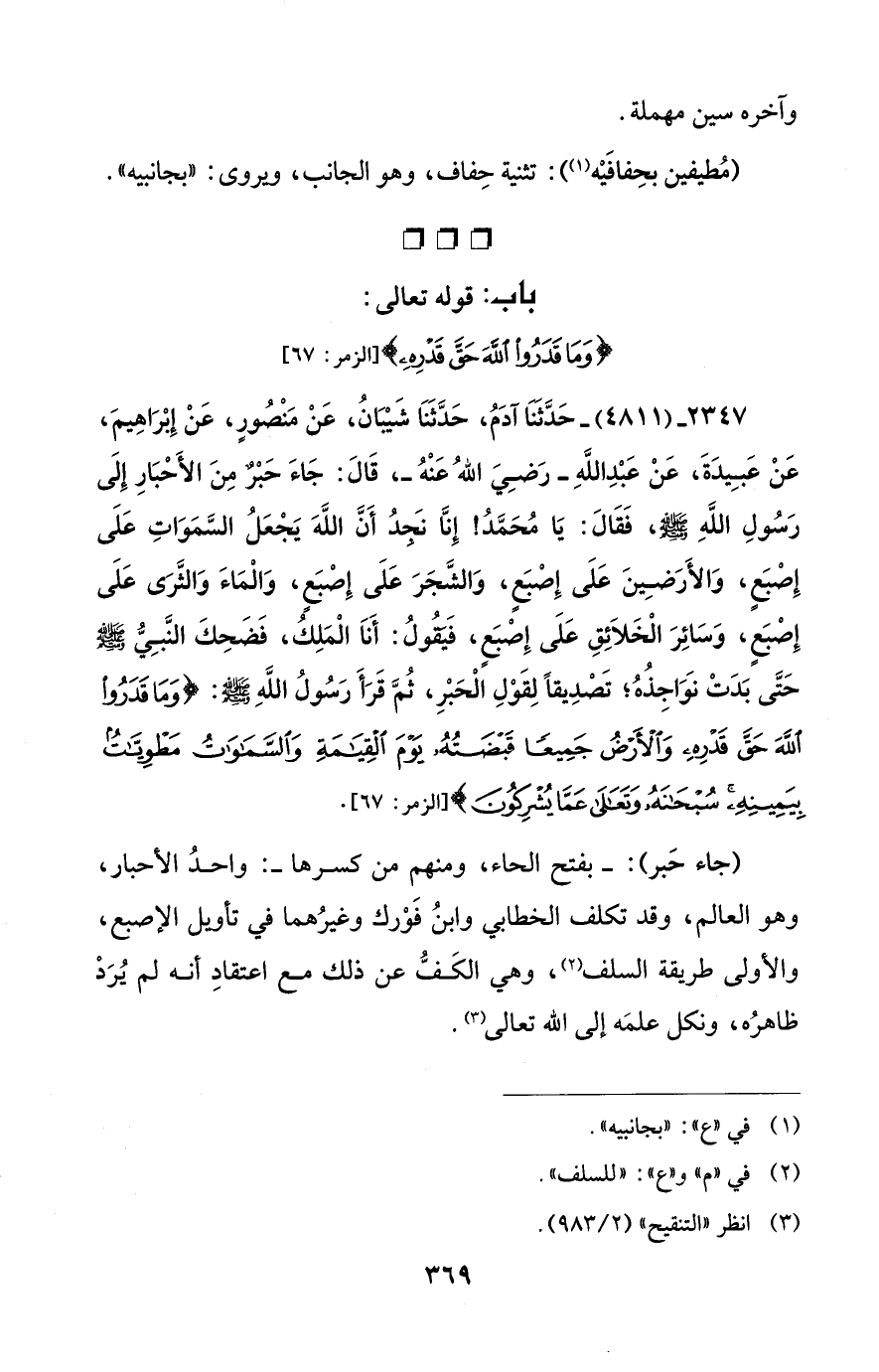 2347 - (4811) - حَدَّثنا آدَمُ، حَدَّثَنَا شَيْبَانُ، عَنْ مَنْصُورٍ، عَنْ إِبْرَاهِيمَ، عَنْ عَبِيدَةَ، عَنْ عَبْدِ اللَّهِ - رضي الله عنه -، قَالَ: جَاءَ حَبْرٌ مِنَ الأَحْبَارِ إِلَى رَسُولِ اللَّهِ - صلى الله عليه وسلم -، فَقَالَ: يَا مُحَمَّدُ! إِنَّا نجَدُ أَنَّ اللَّهَ يَجْعَلُ السَّمَوَاتِ عَلَى إِصْبَعٍ، وَالأَرَضِينَ عَلَى إِصْبَعٍ، وَالشَّجَرَ عَلَى إِصْبَعٍ، وَالْمَاءَ وَالثَّرَى عَلَى إِصْبَعٍ، وَسَائِرَ الْخَلَائِقِ عَلَى إِصْبَعٍ، فَيَقُولُ: أَنَا الْمَلِكُ، فَضَحِكَ النَّبِيُّ - صلى الله عليه وسلم - حَتَّى بَدَتْ نَوَاجِذُهُ؛ تَصْدِيقًا لِقَوْلِ الْحَبْرِ، ثُمَّ قَرَأَ رَسُولُ اللَّهِ - صلى الله عليه وسلم -: {وَمَا قَدَرُوا اللَّهَ حَقَّ قَدْرِهِ وَالْأَرْضُ جَمِيعًا قَبْضَتُهُ يَوْمَ الْقِيَامَةِ وَالسَّمَاوَاتُ مَطْوِيَّاتٌ بِيَمِينِهِ سُبْحَانَهُ وَتَعَالَى عَمَّا يُشْرِكُونَ} [الزمر: 67].