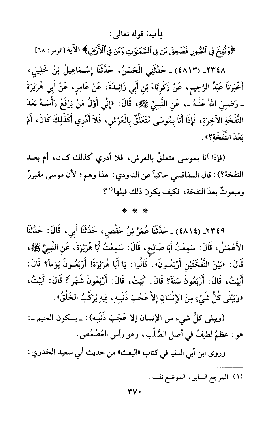 باب: قوله تعالى: {وَنُفِخَ فِي الصُّورِ فَصَعِقَ مَنْ فِي السَّمَاوَاتِ وَمَنْ فِي الْأَرْضِ} الآية [الزمر: 68]
