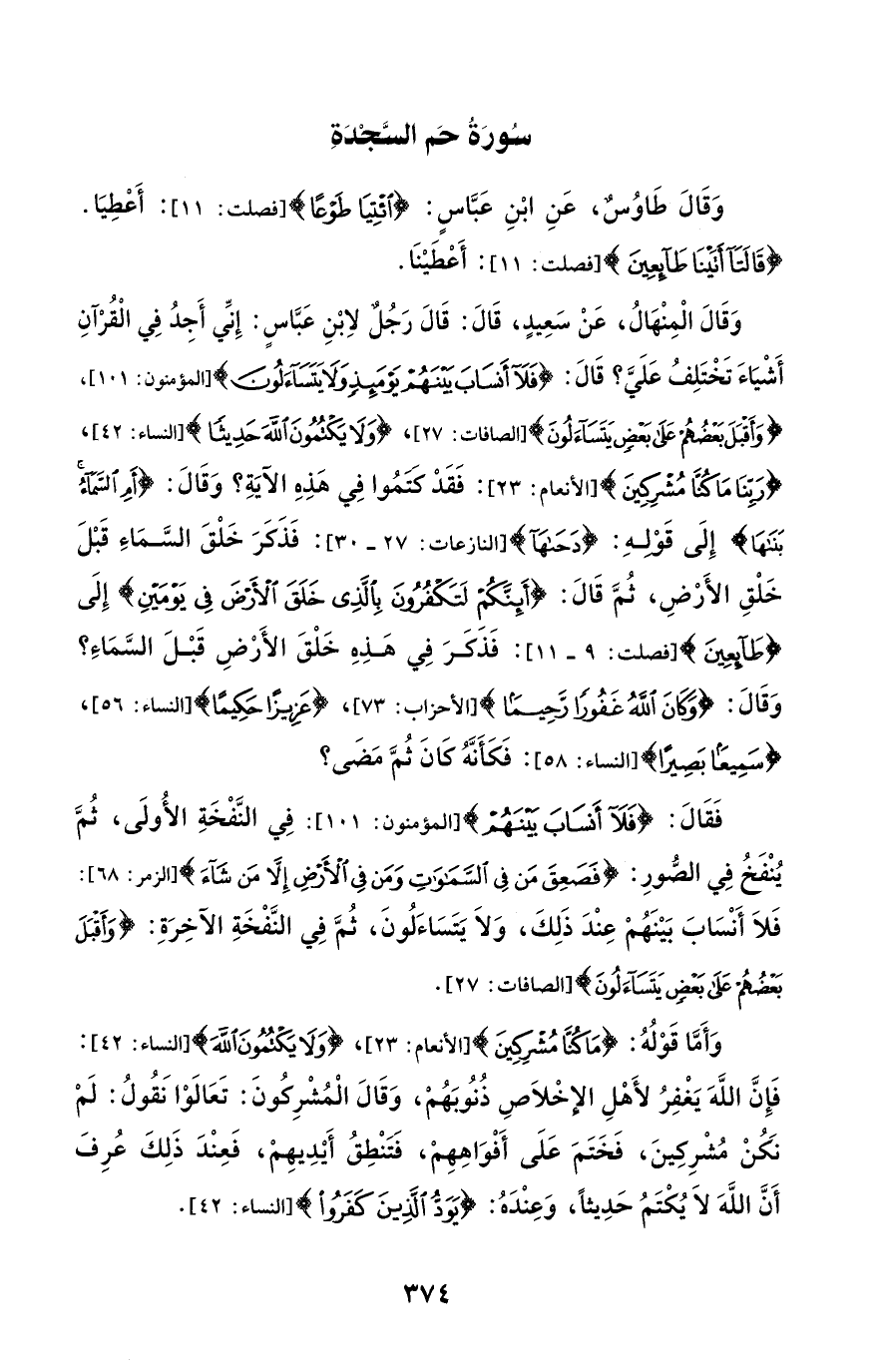 وَقَالَ الْمِنْهَالُ، عَنْ سَعِيدٍ، قَالَ: قَالَ رَجُلٌ لاِبْنِ عَبَّاسٍ: إِنِّي أَجِدُ فِي الْقُرْآنِ أَشْيَاءَ تَخْتَلِفُ عَلَيَّ؟ قَالَ: {فَلَا أَنْسَابَ بَيْنَهُمْ يَوْمَئِذٍ وَلَا يَتَسَاءَلُونَ} [المؤمنون: 101]، {وَأَقْبَلَ بَعْضُهُمْ عَلَى بَعْضٍ يَتَسَاءَلُونَ} [الصافات: 27]، {وَلَا يَكْتُمُونَ اللَّهَ حَدِيثًا} [النساء: 42]، {رَبِّنَا مَا كُنَّا مُشْرِكِينَ} [الأنعام: 23]: فَقَدْ كَتَمُوا فِي هَذِهِ الآيَةِ؟ وَقَالَ: {أَمِ السَّمَاءُ بَنَاهَا} إِلَى قَوْلهِ: {دَحَاهَا} [النازعات: 27 - 30]: فَذَكَرَ خَلْقَ السَّمَاءِ قَبْلَ خَلْقِ الأَرْضِ، ثُمَّ قَالَ: {أَئِنَّكُمْ لَتَكْفُرُونَ بِالَّذِي خَلَقَ الْأَرْضَ فِي يَوْمَيْنِ} إِلَى {طَائِعِينَ} [فصلت: 9 - 11]: فَذكَرَ فِي هَذِهِ خَلْقَ الأَرْضِ قَبْلَ السَّمَاءِ؟ وَقَالَ: {وَكَانَ اللَّهُ غَفُورًا رَحِيمًا} [الأحزاب: 73]، {عَزِيزًا حَكِيمًا} [النساء: 56]، {سَمِيعًا بَصِيرًا} [النساء: 58] فَكَأَنَّهُ كَانَ ثُمَّ مَضَى؟
