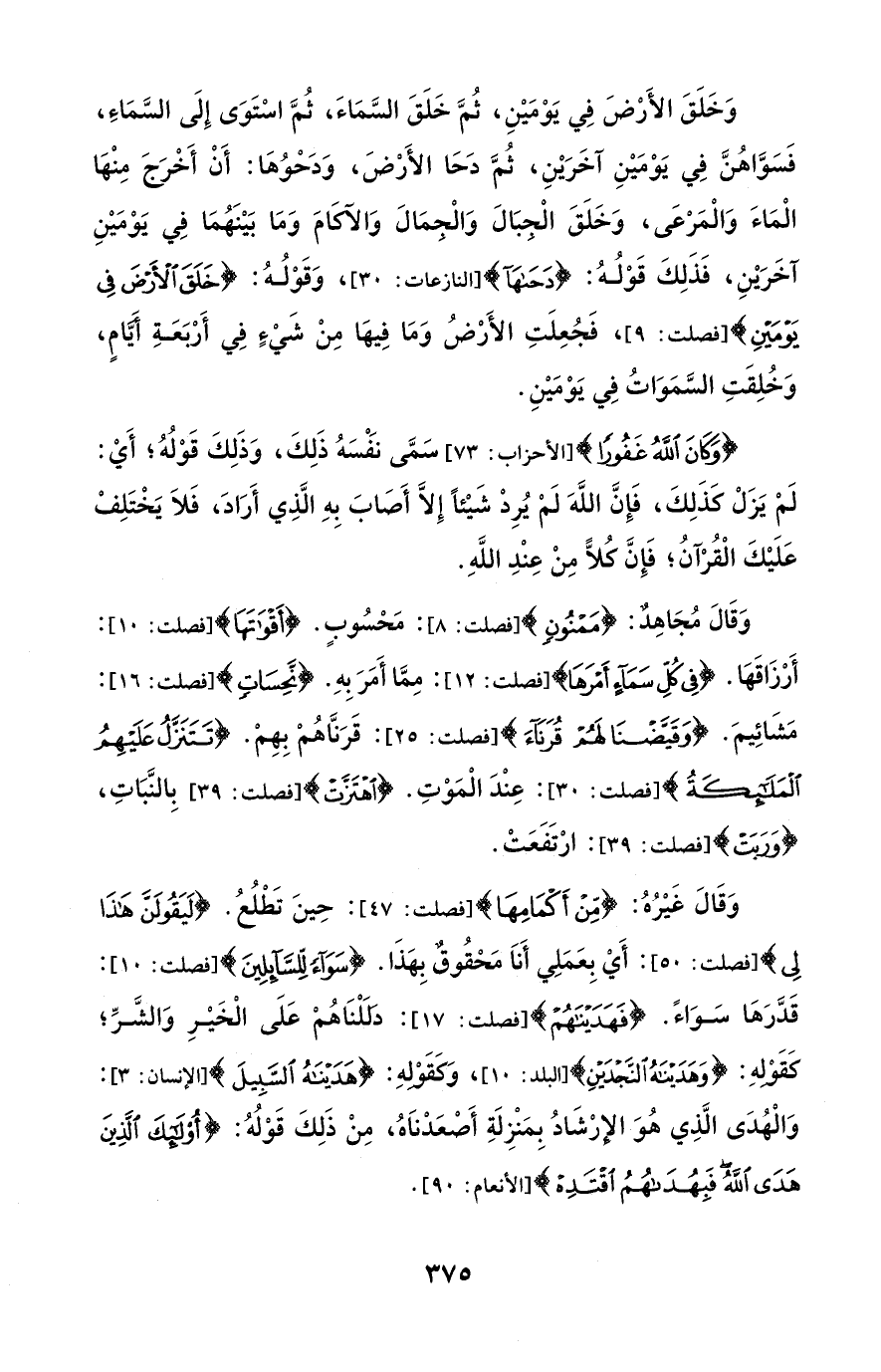 وَخَلَقَ الأَرْضَ فِي يَوْمَيْنِ، ثمَّ خَلَقَ السَّمَاءَ، ثُمَّ اسْتَوَى إِلَى السَّمَاءِ، فَسَوَّاهُنَّ فِي يَوْمَيْنِ آخَرَيْنِ، ثُمَّ دَحَا الأَرْضَ، وَدَحْوُهَا: أَنْ أَخْرَجَ مِنْهَا الْمَاءَ وَالْمَرْعَى، وَخَلَقَ الْجبَالَ وَالْجمَالَ وَالآكامَ وَمَا بَيْنَهُمَا فِي يَوْمَيْنِ آخَرَيْنِ، فَذَلِكَ قَوْلُهُ: {دَحَاهَا} [النازعات: 30]، وَقَوْلُهُ: {خَلَقَ الْأَرْضَ فِي يَوْمَيْنِ} [فصلت: 9]، فَجُعِلَتِ الأَرْضُ وَمَا فِيهَا مِنْ شَيْءٍ فِي أَرْبَعَةِ أَيَّامٍ، وَخُلِقَتِ السَّمَوَاتُ فِي يَوْمَيْنِ.