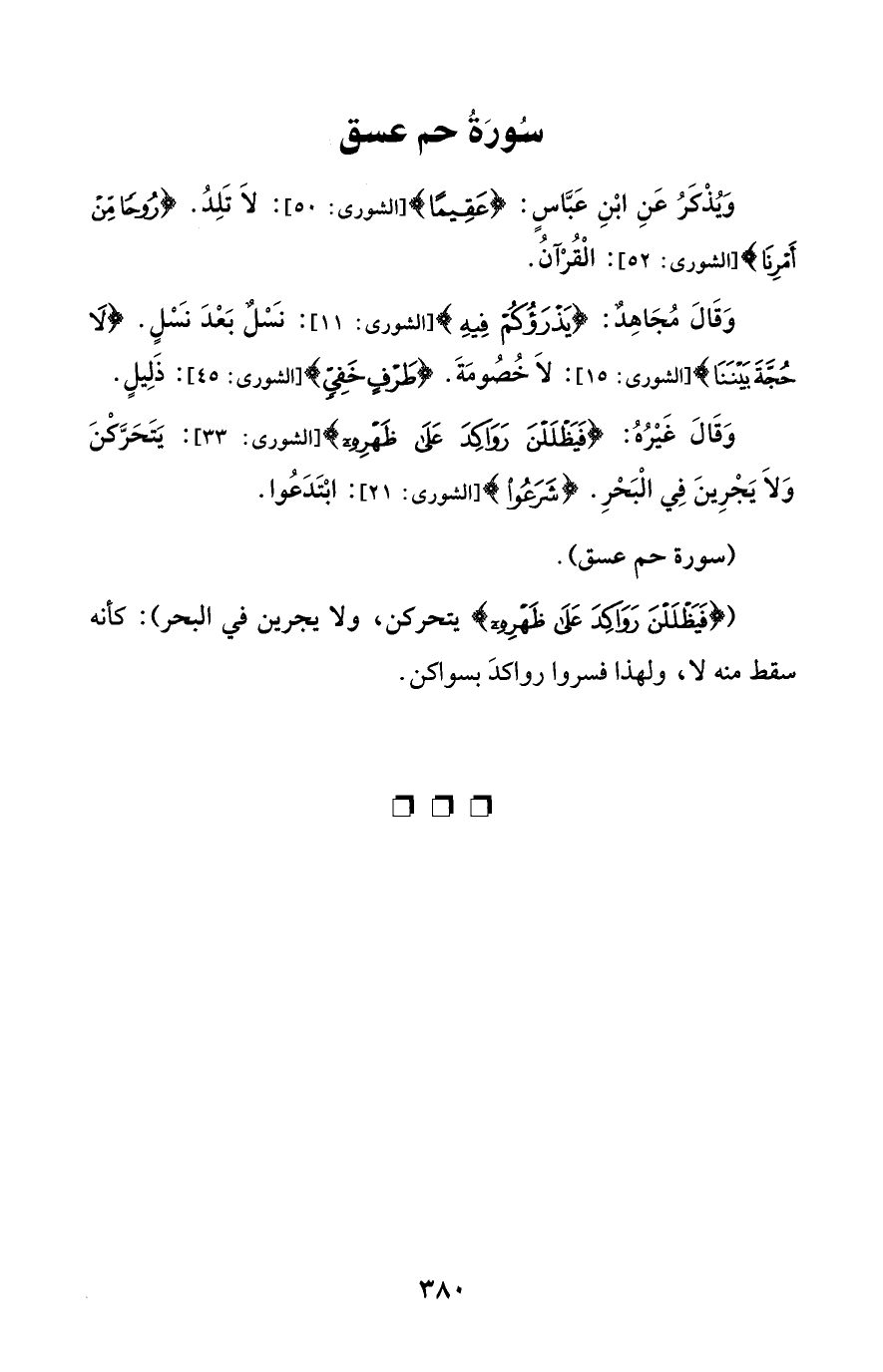 وَيُذْكَرُ عَنِ ابْنِ عَبَّاسٍ: {عَقِيمًا} [الشورى: 50]: لَا تَلِدُ. {رُوحًا مِنْ أَمْرِنَا} [الشورى: 52]: الْقُرْآنُ.