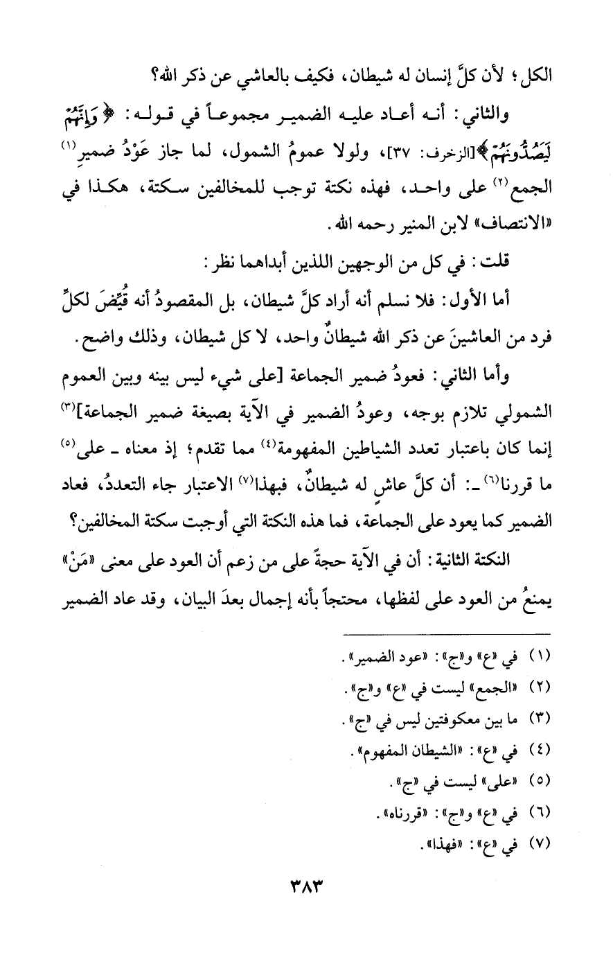 وأما الثاني: فعودُ ضمير الجماعة [على شيء ليس بينه وبين العموم الشمولي تلازم بوجه، وعودُ الضمير في الآية بصيغة ضمير الجماعة] (¬3) إنما كان باعتبار تعدد الشياطين المفهومة (¬4) مما تقدم؛ إذ معناه -على (¬5) ما قررنا (¬6) -: أن كلَّ عاشٍ له شيطانٌ، فبهذا (¬7) الاعتبار جاء التعددُ، فعاد الضمير كما يعود على الجماعة، فما هذه النكتة التي أوجبت سكتة المخالفين؟