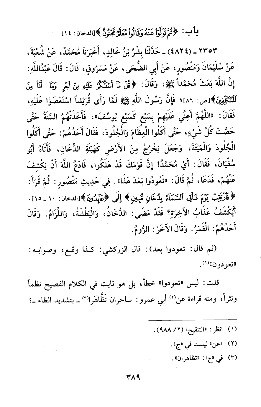 2353 - (4824) - حَدَّثَنَا بِشْرُ بْنُ خَالِدٍ، أَخْبَرَنَا مُحَمَّدٌ، عَنْ شُعْبَةَ، عَنْ سُلَيْمَانَ وَمَنْصُورٍ، عَنْ أَبي الضُّحَى، عَنْ مَسْرُوقٍ، قَالَ: قَالَ عَبْدُ اللَّهِ: إِنَّ اللَّهَ بَعَثَ مُحَمَّدًا - صلى الله عليه وسلم -، وَقَالَ: {قُلْ مَا أَسْأَلُكُمْ عَلَيْهِ مِنْ أَجْرٍ وَمَا أَنَا مِنَ الْمُتَكَلِّفِينَ} [ص: 86]؛ فَإِنَّ رَسُولَ اللَّهِ - صلى الله عليه وسلم - لَمَّا رَأَى قُرَيْشًا اسْتَعْصَوْا عَلَيْهِ، فَقَالَ: "اللَّهُمَّ أَعِنِّي عَلَيْهِمْ بِسَبعٍ كسَبع يُوسُفَ"، فَأَخَذَتْهُمُ السَّنَةُ حَتَّى حَصَّتْ كُلَّ شَيْءٍ، حَتَّى أَكَلُوا الْعِظَامَ وَالْجُلُودَ، فَقَالَ أَحَدُهُمْ: حَتَّى أَكَلُوا الْجُلُودَ وَالْمَيْتَةَ، وَجَعَلَ يَخْرُجُ مِنَ الأَرْضِ كَهَيْئَةِ الدُّخَانِ، فَأَتَاهُ أَبُو سُفْيَانَ، فَقَالَ: أَيْ مُحَمَّدُ! إِنَّ قَوْمَكَ قَدْ هَلَكُوا، فَادْعُ اللَّهَ أَنْ يَكْشِفَ عَنْهُمْ، فَدَعَا، ثُمَّ قَالَ: "تَعُودُوا بَعْدَ هَذَا". فِي حَدِيثِ مَنْصُورٍ: ثُمَّ قَرَأَ: {فَارْتَقِبْ يَوْمَ تَأْتِي السَّمَاءُ بِدُخَانٍ مُبِينٍ} إِلَى {عَائِدُونَ} [الدخان: 10 - 15]. أَيُكْشَفُ عَذَابُ الآخِرَةِ؟ فَقَدْ مَضَى: الدُّخَانُ، وَالْبَطْشَةُ، وَاللِّزَامُ. وَقَالَ أَحَدُهُمُ: الْقَمَرُ. وَقَالَ الآخَرُ: الرُّومُ.