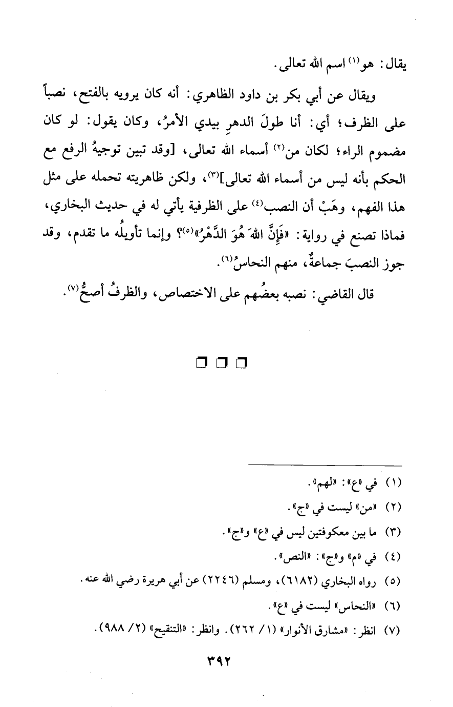 ويقال عن أبي بكر بن داود الظاهري: أنه كان يرويه بالفتح، نصبًا على الظرف؛ أي: أنا طولَ الدهرِ بيدي الأمرُ، وكان يقول: لو كان مضموم الراء؛ لكان من (¬2) أسماء الله تعالى، [وقد تبين توجيهُ الرفع مع الحكم بأنه ليس من أسماء الله تعالى] (¬3)، ولكن ظاهريته تحمله على مثل هذا الفهم، وهَبْ أن النصب (¬4) على الظرفية يأتي له في حديث البخاري، فماذا تصنع في رواية: "فَإِنَّ اللهَ هُوَ الدَّهْرُ" (¬5)؟ وإنما تأويلُه ما تقدم، وقد جوز النصبَ جماعةٌ، منهم النحاسُ (¬6).