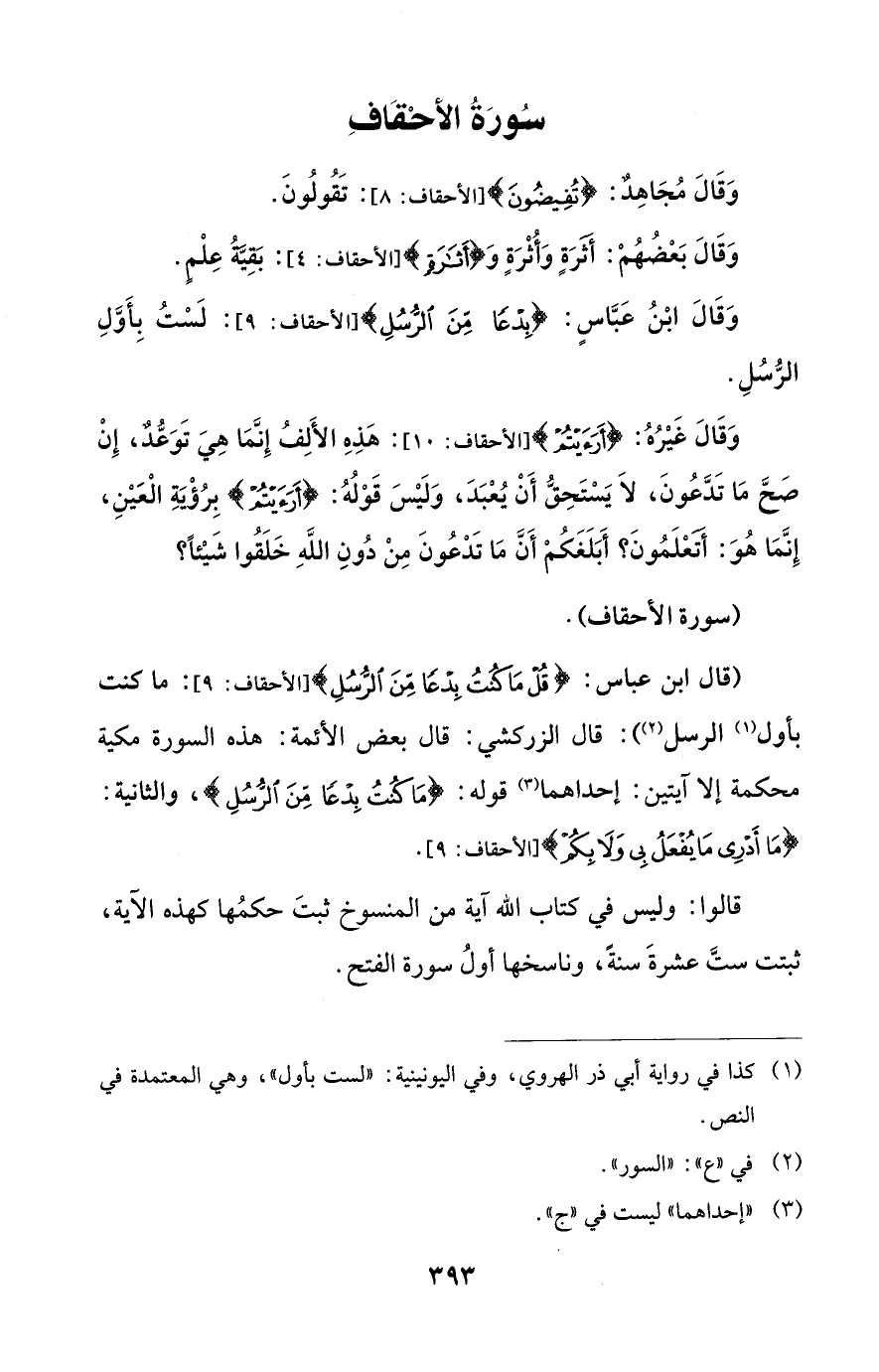 (قال ابن عباس: {قُلْ مَا كُنْتُ بِدْعًا مِنَ الرُّسُلِ} [الأحقاف: 9]: ما كنت بأول (¬1) الرسل (¬2)): قال الزركشي: قال بعض الأئمة: هذه السورة مكية محكمة إلا آيتين: إحداهما (¬3) قوله: {مَا كُنْتُ بِدْعًا مِنَ الرُّسُلِ}، والثانية: {مَا أَدْرِي مَا يُفْعَلُ بِي وَلَا بِكُمْ} [الأحقاف: 9].
