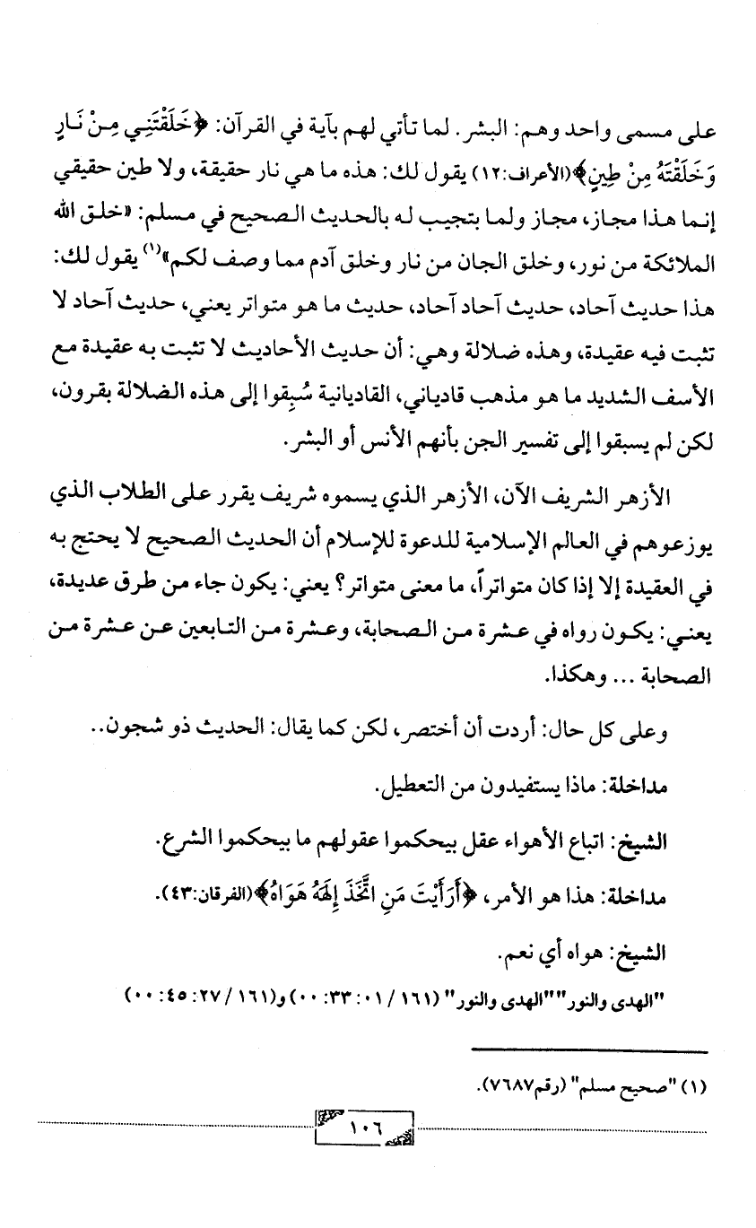 على مسمى واحد وهم: البشر. لما تأتي لهم بآية في القرآن: {خَلَقْتَنِي مِنْ نَارٍ وَخَلَقْتَهُ مِنْ طِينٍ} (الأعراف:12) يقول لك: هذه ما هي نار حقيقة، ولا طين حقيقي إنما هذا مجاز، مجاز ولما بتجيب له بالحديث الصحيح في مسلم: «خلق الله الملائكة من نور، وخلق الجان من نار وخلق آدم مما وصف لكم» (¬1) يقول لك: هذا حديث آحاد، حديث آحاد آحاد، حديث ما هو متواتر يعني، حديث آحاد لا تثبت فيه عقيدة، وهذه ضلالة وهي: أن حديث الأحاديث لا تثبت به عقيدة مع الأسف الشديد ما هو مذهب قادياني، القاديانية سُبِقوا إلى هذه الضلالة بقرون، لكن لم يسبقوا إلى تفسير الجن بأنهم الأنس أو البشر.