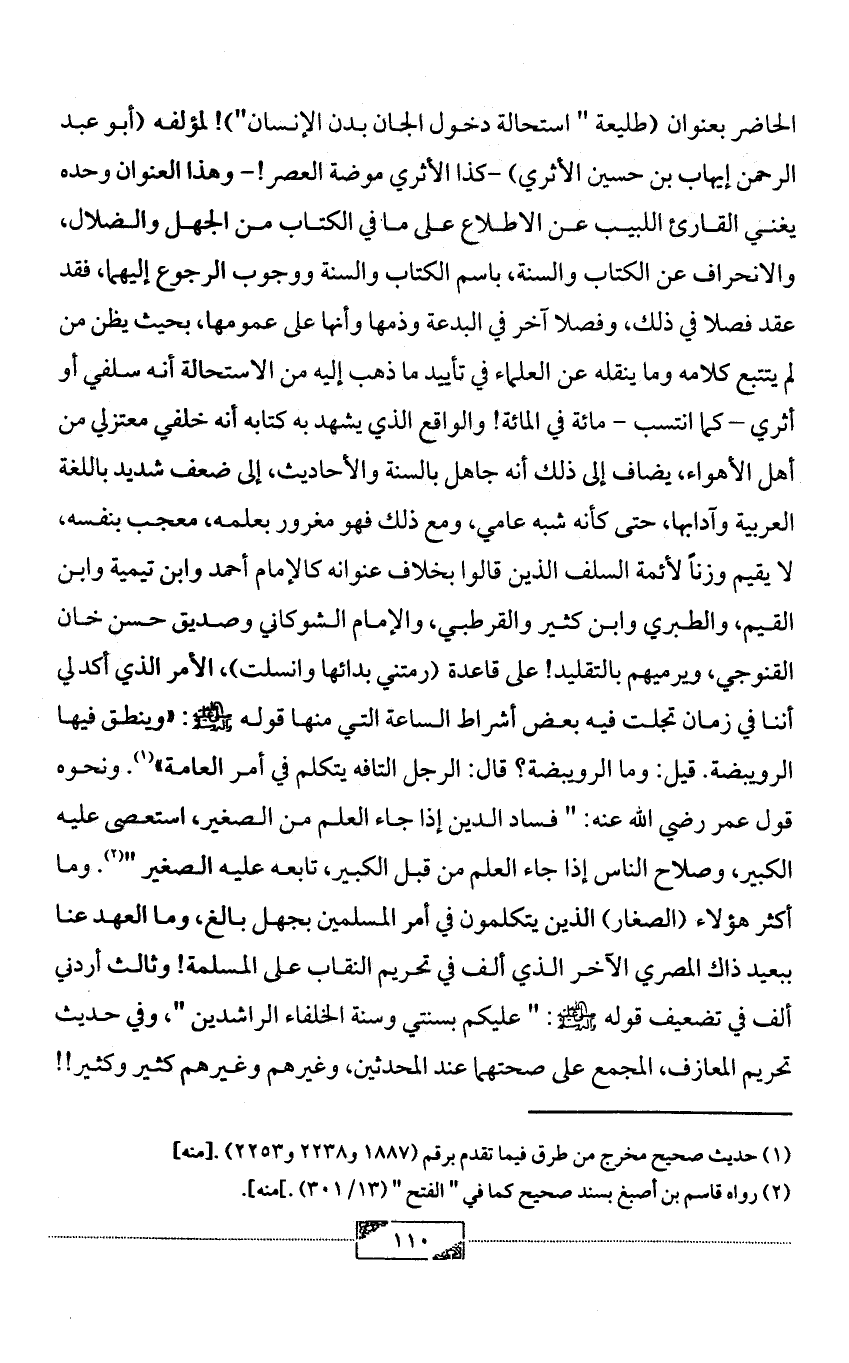 الحاضر بعنوان (طليعة " استحالة دخول الجان بدن الإنسان")! لمؤلفه (أبو عبد الرحمن إيهاب بن حسين الأثري) -كذا الأثري موضة العصر! - وهذا العنوان وحده يغني القارئ اللبيب عن الاطلاع على ما في الكتاب من الجهل والضلال، والانحراف عن الكتاب والسنة، باسم الكتاب والسنة ووجوب الرجوع إليهما، فقد عقد فصلا في ذلك، وفصلا آخر في البدعة وذمها وأنها على عمومها، بحيث يظن من لم يتتبع كلامه وما ينقله عن العلماء في تأييد ما ذهب إليه من الاستحالة أنه سلفي أو أثري - كما انتسب - مائة في المائة! والواقع الذي يشهد به كتابه أنه خلفي معتزلي من أهل الأهواء، يضاف إلى ذلك أنه جاهل بالسنة والأحاديث، إلى ضعف شديد باللغة العربية وآدابها، حتى كأنه شبه عامي، ومع ذلك فهو مغرور بعلمه، معجب بنفسه، لا يقيم وزناً لأئمة السلف الذين قالوا بخلاف عنوانه كالإمام أحمد وابن تيمية وابن القيم، والطبري وابن كثير والقرطبي، والإمام الشوكاني وصديق حسن خان القنوجي، ويرميهم بالتقليد! على قاعدة (رمتني بدائها وانسلت)، الأمر الذي أكد لي أننا في زمان تجلت فيه بعض أشراط الساعة التي منها قوله - صلى الله عليه وآله وسلم -: «وينطق فيها الرويبضة. قيل: وما الرويبضة؟ قال: الرجل التافه يتكلم في أمر العامة» (¬1). ونحوه قول عمر رضي الله عنه: " فساد الدين إذا جاء العلم من الصغير، استعصى عليه الكبير، وصلاح الناس إذا جاء العلم من قبل الكبير، تابعه عليه الصغير " (¬2). وما أكثر هؤلاء (الصغار) الذين يتكلمون في أمر المسلمين بجهل بالغ، وما العهد عنا ببعيد ذاك المصري الآخر الذي ألف في تحريم النقاب على المسلمة! وثالث أردني ألف في تضعيف قوله - صلى الله عليه وآله وسلم -: " عليكم بسنتي وسنة الخلفاء الراشدين "، وفي حديث تحريم المعازف، المجمع على صحتهما عند المحدثين، وغيرهم وغيرهم كثير وكثير!!