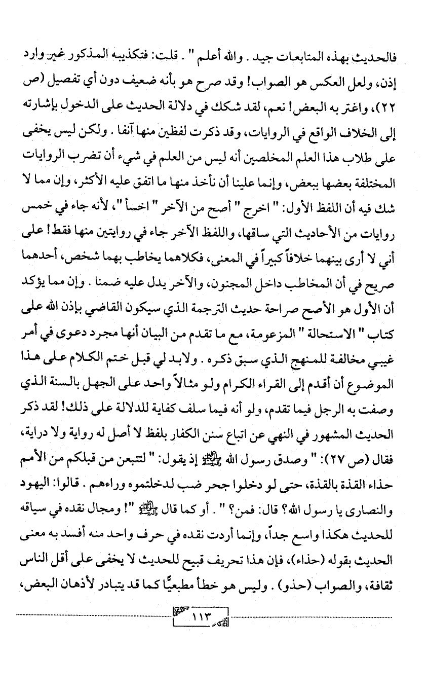 فالحديث بهذه المتابعات جيد. والله أعلم ". قلت: فتكذيبه المذكور غير وارد إذن، ولعل العكس هو الصواب! وقد صرح هو بأنه ضعيف دون أي تفصيل (ص 22)، واغتر به البعض! نعم، لقد شكك في دلالة الحديث على الدخول بإشارته إلى الخلاف الواقع في الروايات، وقد ذكرت لفظين منها آنفا. ولكن ليس يخفى على طلاب هذا العلم المخلصين أنه ليس من العلم في شيء أن تضرب الروايات المختلفة بعضها ببعض، وإنما علينا أن نأخذ منها ما اتفق عليه الأكثر، وإن مما لا شك فيه أن اللفظ الأول: " اخرج " أصح من الآخر " اخسأ "، لأنه جاء في خمس روايات من الأحاديث التي ساقها، واللفظ الآخر جاء في روايتين منها فقط! على أني لا أرى بينهما خلافاً كبيراً في المعنى، فكلاهما يخاطب بهما شخص، أحدهما صريح في أن المخاطب داخل المجنون، والآخر يدل عليه ضمنا. وإن مما يؤكد أن الأول هو الأصح صراحة حديث الترجمة الذي سيكون القاضي بإذن الله على كتاب " الاستحالة " المزعومة، مع ما تقدم من البيان أنها مجرد دعوى في أمر غيبي مخالفة للمنهج الذي سبق ذكره. ولابد لي قبل ختم الكلام على هذا الموضوع أن أقدم إلى القراء الكرام ولو مثالاً واحد على الجهل بالسنة الذي وصفت به الرجل فيما تقدم، ولو أنه فيما سلف كفاية للدلالة على ذلك! لقد ذكر الحديث المشهور في النهي عن اتباع سنن الكفار بلفظ لا أصل له رواية ولا دراية، فقال (ص 27): " وصدق رسول الله - صلى الله عليه وآله وسلم - إذ يقول: " لتتبعن من قبلكم من الأمم حذاء القذة بالقذة، حتى لو دخلوا جحر ضب لدخلتموه وراءهم. قالوا: اليهود والنصارى يا رسول الله؟ قال: فمن؟ ". أو كما قال - صلى الله عليه وآله وسلم - "! ومجال نقده في سياقه للحديث هكذا واسع جداً، وإنما أردت نقده في حرف واحد منه أفسد به معنى الحديث بقوله (حذاء)، فإن هذا تحريف قبيح للحديث لا يخفى على أقل الناس ثقافة، والصواب (حذو). وليس هو خطأ مطبعيًّا كما قد يتبادر لأذهان البعض،