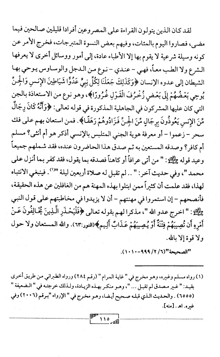 لقد كان الذين يتولون القراءة على المصروعين أفرادا قليلين صالحين فيما مضى، فصاروا اليوم بالمئات، وفيهم بعض النسوة المتبرجات، فخرج الأمر عن كونه وسيلة شرعية لا يقوم بها إلا الأطباء عادة، إلى أمور ووسائل أخرى لا يعرفها الشرع ولا الطب معاً، فهي - عندي - نوع من الدجل والوساوس يوحي بها الشيطان إلى عدوه الإنسان {وَكَذَلِكَ جَعَلْنَا لِكُلِّ نِبِيٍّ عَدُوًّا شَيَاطِينَ الإِنسِ وَالْجِنِّ يُوحِي بَعْضُهُمْ إِلَى بَعْضٍ زُخْرُفَ الْقَوْلِ غُرُورًا}، وهو نوع من الاستعاذة بالجن التي كان عليها المشركون في الجاهلية المذكورة في قوله تعالى: {وَأَنَّهُ كَانَ رِجَالٌ مِّنَ الإِنسِ يَعُوذُونَ بِرِجَالٍ مِّنَ الْجِنِّ فَزَادُوهُمْ رَهَقًا}. فمن استعان بهم على فك سحر - زعموا - أو معرفة هوية الجني المتلبس بالإنسي أذكر هو أم أنثى؟ مسلم أم كافر؟ وصدقه المستعين به ثم صدق هذا الحاضرون عنده، فقد شملهم جميعاً وعيد قوله - صلى الله عليه وآله وسلم -: " من أتى عرافاً أو كاهناً فصدقه بما يقول، فقد كفر بما أنزل على محمد "، وفي حديث آخر: " .. لم تقبل له صلاة أربعين ليلة " (¬1). فينبغي الانتباه لهذا، فقد علمت أن كثيراً ممن ابتلوا بهذه المهنة هم من الغافلين عن هذه الحقيقة، فأنصحهم - إن استمروا في مهنتهم - أن لا يزيدوا في مخاطبتهم على قول النبي - صلى الله عليه وآله وسلم -: " اخرج عدو الله "، مذكرا لهم بقوله تعالى {فَلْيَحْذَرِ الَّذِينَ يُخَالِفُونَ عَنْ أَمْرِهِ أَن تُصِيبَهُمْ فِتْنَةٌ أَوْ يُصِيبَهُمْ عَذَابٌ أَلِيم} (النور:63). والله المستعان ولا حول ولا قوة إلا بالله.