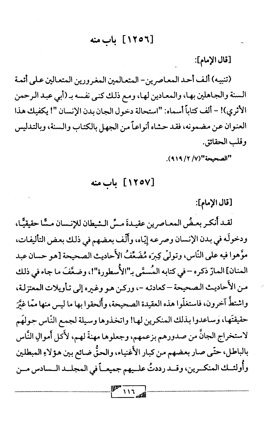 (تنبيه) ألف أحد المعاصرين- المتعالمين المغرورين المتعالين على أئمة السنة والجاهلين بها، والمعادين لها، ومع ذلك كنى نفسه بـ (أبي عبد الرحمن الأثري)! - ألف كتاباً أسماه: "استحالة دخول الجان بدن الإنسان "! يكفيك هذا العنوان عن مضمونه، فقد حشاه أنواعاً من الجهل بالكتاب والسنة، وبالتدليس وقلب الحقائق.
