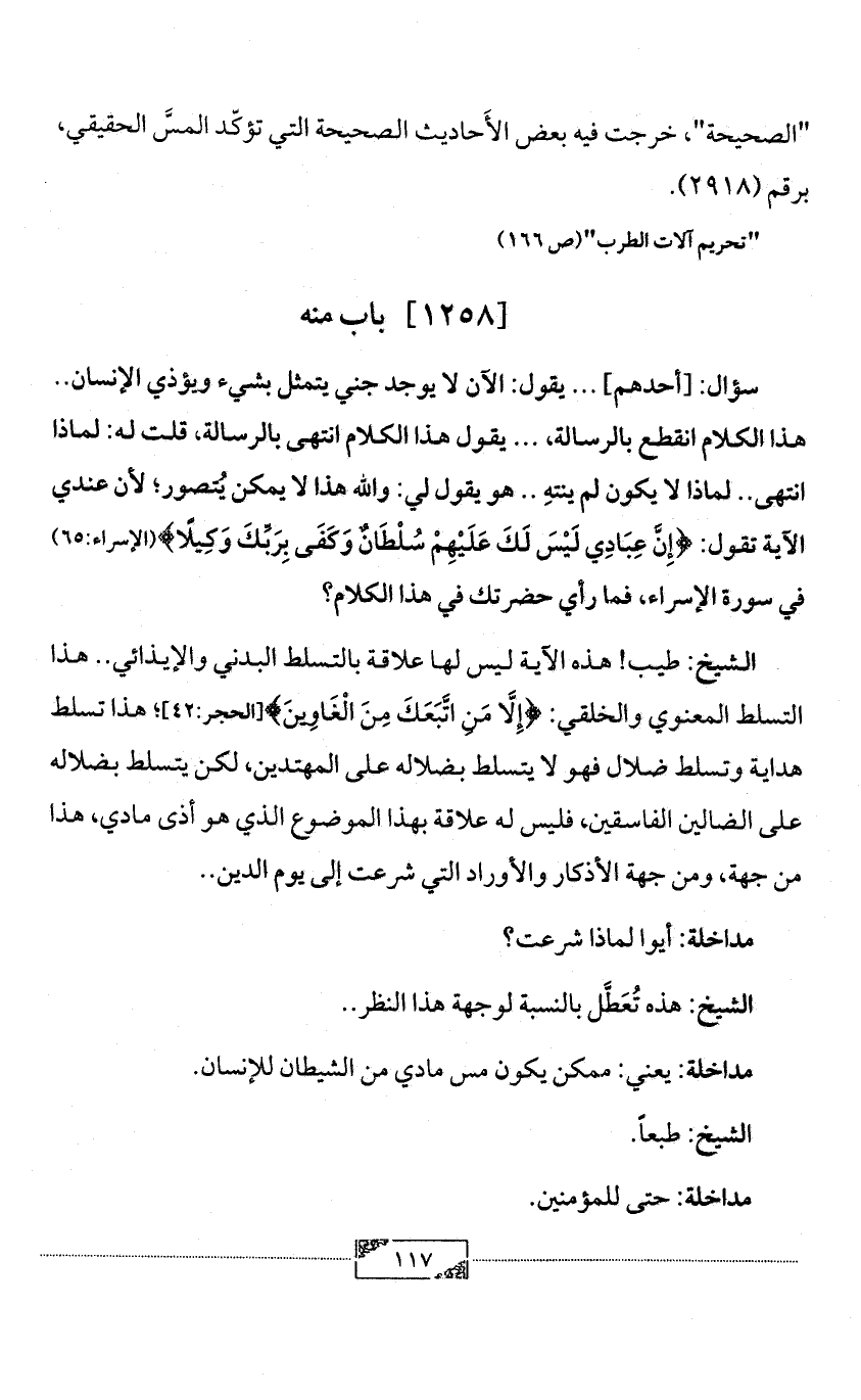 الشيخ: طيب! هذه الآية ليس لها علاقة بالتسلط البدني والإيذائي .. هذا التسلط المعنوي والخلقي: {إِلَّا مَنِ اتَّبَعَكَ مِنَ الْغَاوِينَ} [الحجر:42]؛ هذا تسلط هداية وتسلط ضلال فهو لا يتسلط بضلاله على المهتدين، لكن يتسلط بضلاله على الضالين الفاسقين، فليس له علاقة بهذا الموضوع الذي هو أذى مادي، هذا من جهة، ومن جهة الأذكار والأوراد التي شرعت إلى يوم الدين ..