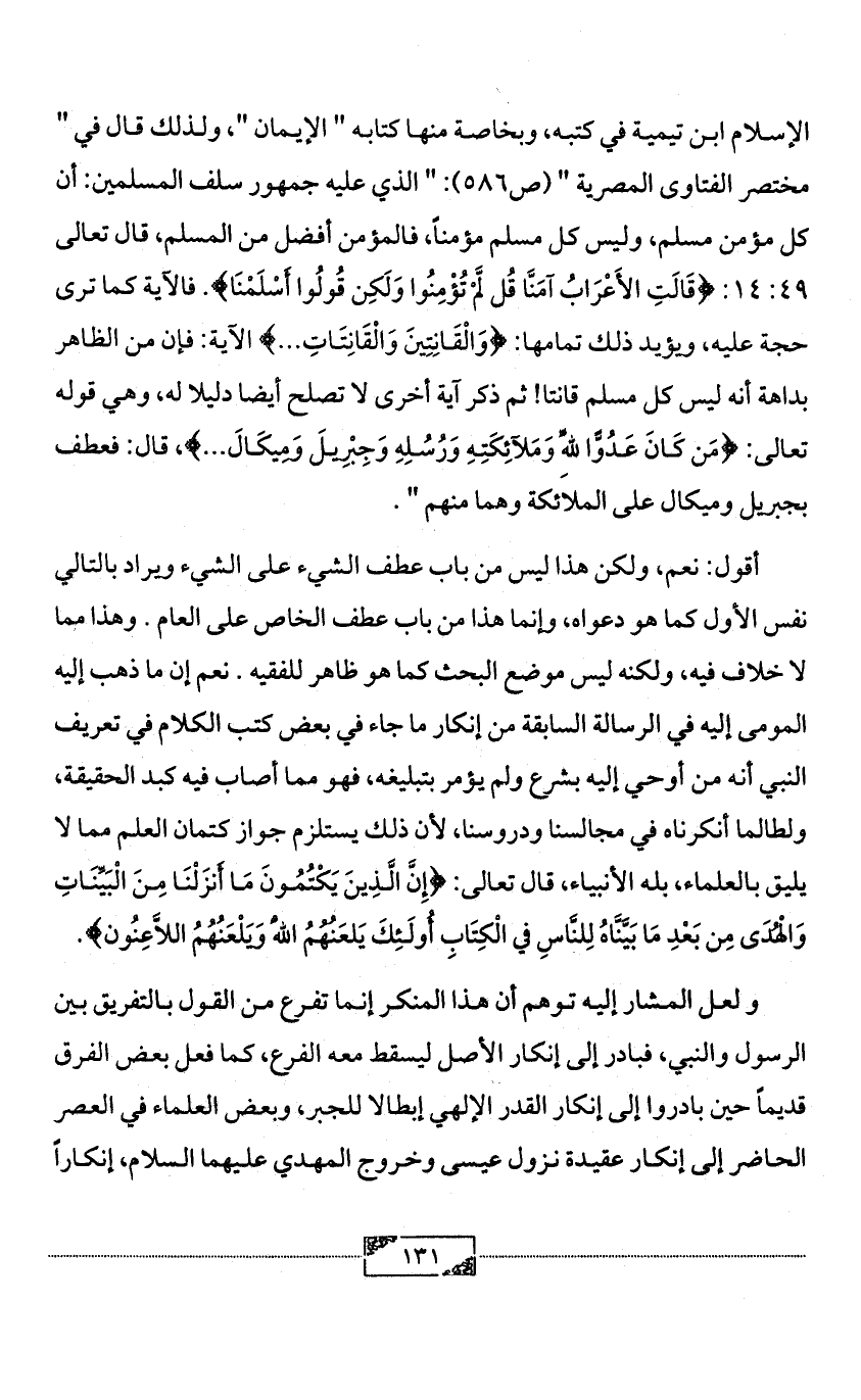الإسلام ابن تيمية في كتبه، وبخاصة منها كتابه " الإيمان "، ولذلك قال في " مختصر الفتاوى المصرية " (ص586): " الذي عليه جمهور سلف المسلمين: أن كل مؤمن مسلم، وليس كل مسلم مؤمناً، فالمؤمن أفضل من المسلم، قال تعالى 49: 14: {قَالَتِ الأَعْرَابُ آمَنَّا قُل لَّمْ تُؤْمِنُوا وَلَكِن قُولُوا أَسْلَمْنَا}. فالآية كما ترى حجة عليه، ويؤيد ذلك تمامها: {وَالْقَانِتِينَ وَالْقَانِتَاتِ ... } الآية: فإن من الظاهر بداهة أنه ليس كل مسلم قانتا! ثم ذكر آية أخرى لا تصلح أيضا دليلا له، وهي قوله تعالى: {مَن كَانَ عَدُوًّا لِّلّهِ وَمَلآئِكَتِهِ وَرُسُلِهِ وَجِبْرِيلَ وَمِيكَالَ ... }، قال: فعطف بجبريل وميكال على الملائكة وهما منهم ".