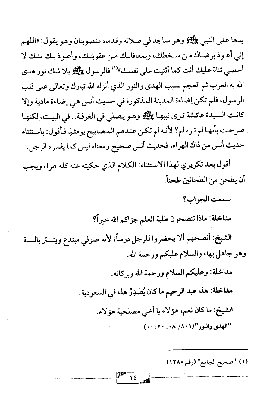 يدها على النبي - صلى الله عليه وآله وسلم - وهو ساجد في صلاته وقدماه منصوبتان وهو يقول: «اللهم إني أعوذ برضاك من سخطك، وبمعافاتك من عقوبتك، وأعوذ بك منك لا أحصي ثناءً عليك أنت كما أثنيت على نفسك» (¬1) فالرسول - صلى الله عليه وآله وسلم - بلا شك نور هدى الله به العرب ثم العجم بسبب الهدى والنور الذي أنزله الله تبارك وتعالى على قلب الرسول، فلم تكن إضاءة المدينة المذكورة في حديث أنس هي إضاءة مادية وإلا كانت السيدة عائشة ترى نبيها - صلى الله عليه وآله وسلم - وهو يصلي في الغرفة .. في البيت، لكنها صرحت بأنها لم تره لم؟ لأنه لم تكن عندهم المصابيح يومئذٍ فأقول: باستثناء حديث أنس من ذاك الهراء، فحديث أنس صحيح ومعناه ليس كما يفسره الرجل.