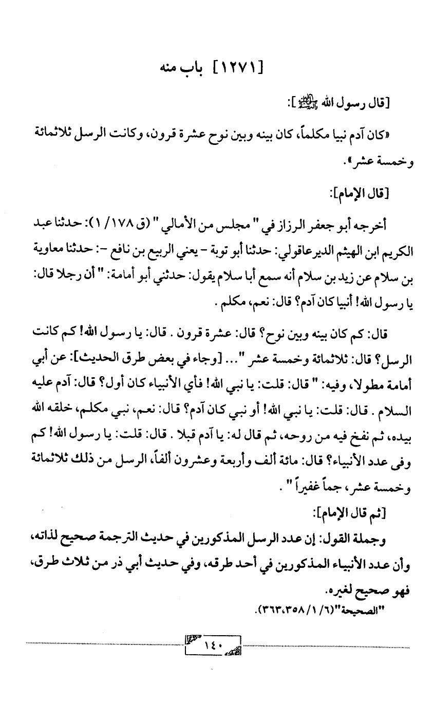«كان آدم نبيا مكلماً، كان بينه وبين نوح عشرة قرون، وكانت الرسل ثلاثمائة وخمسة عشر».