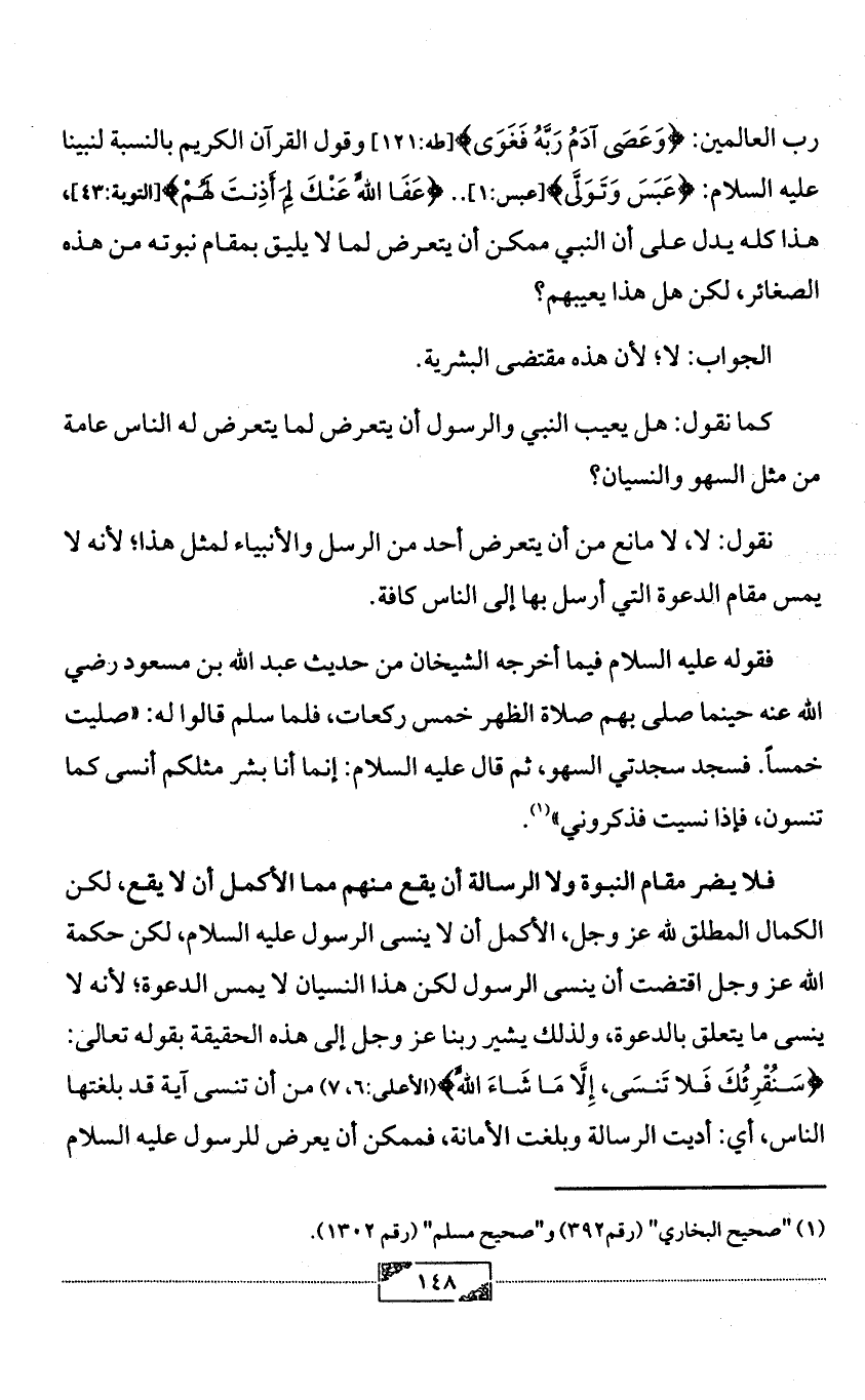 فلا يضر مقام النبوة ولا الرسالة أن يقع منهم مما الأكمل أن لا يقع، لكن الكمال المطلق لله عز وجل، الأكمل أن لا ينسى الرسول عليه السلام، لكن حكمة الله عز وجل اقتضت أن ينسى الرسول لكن هذا النسيان لا يمس الدعوة؛ لأنه لا ينسى ما يتعلق بالدعوة، ولذلك يشير ربنا عز وجل إلى هذه الحقيقة بقوله تعالى: {سَنُقْرِئُكَ فَلا تَنسَى، إِلَّا مَا شَاءَ اللَّهُ} (الأعلى:6، 7) من أن تنسى آية قد بلغتها الناس، أي: أديت الرسالة وبلغت الأمانة، فممكن أن يعرض للرسول عليه السلام