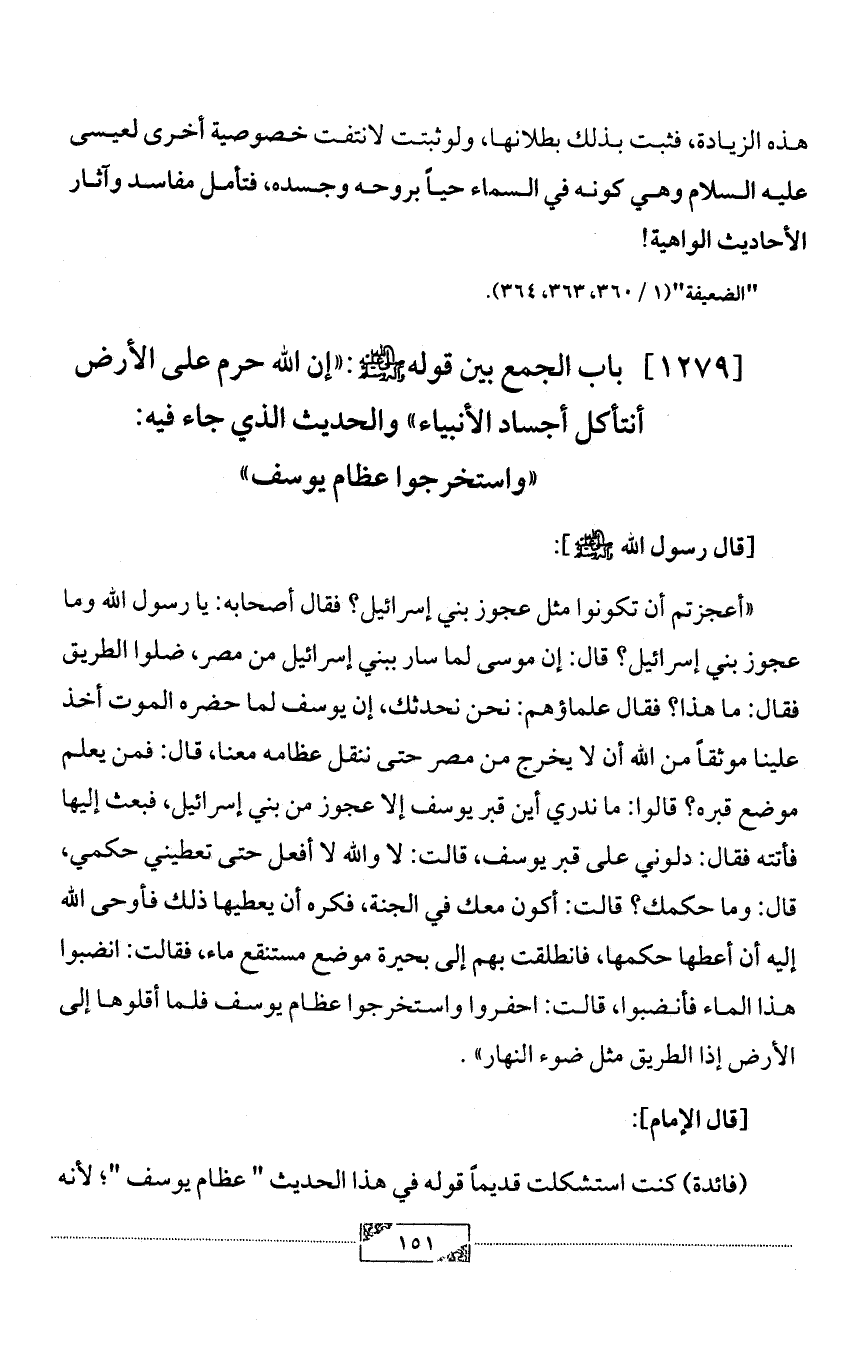 [1279] باب الجمع بين قوله - صلى الله عليه وآله وسلم -: «إن الله حرم على الأرض أن تأكل أجساد الأنبياء» والحديث الذي جاء فيه: «واستخرجوا عظام يوسف»