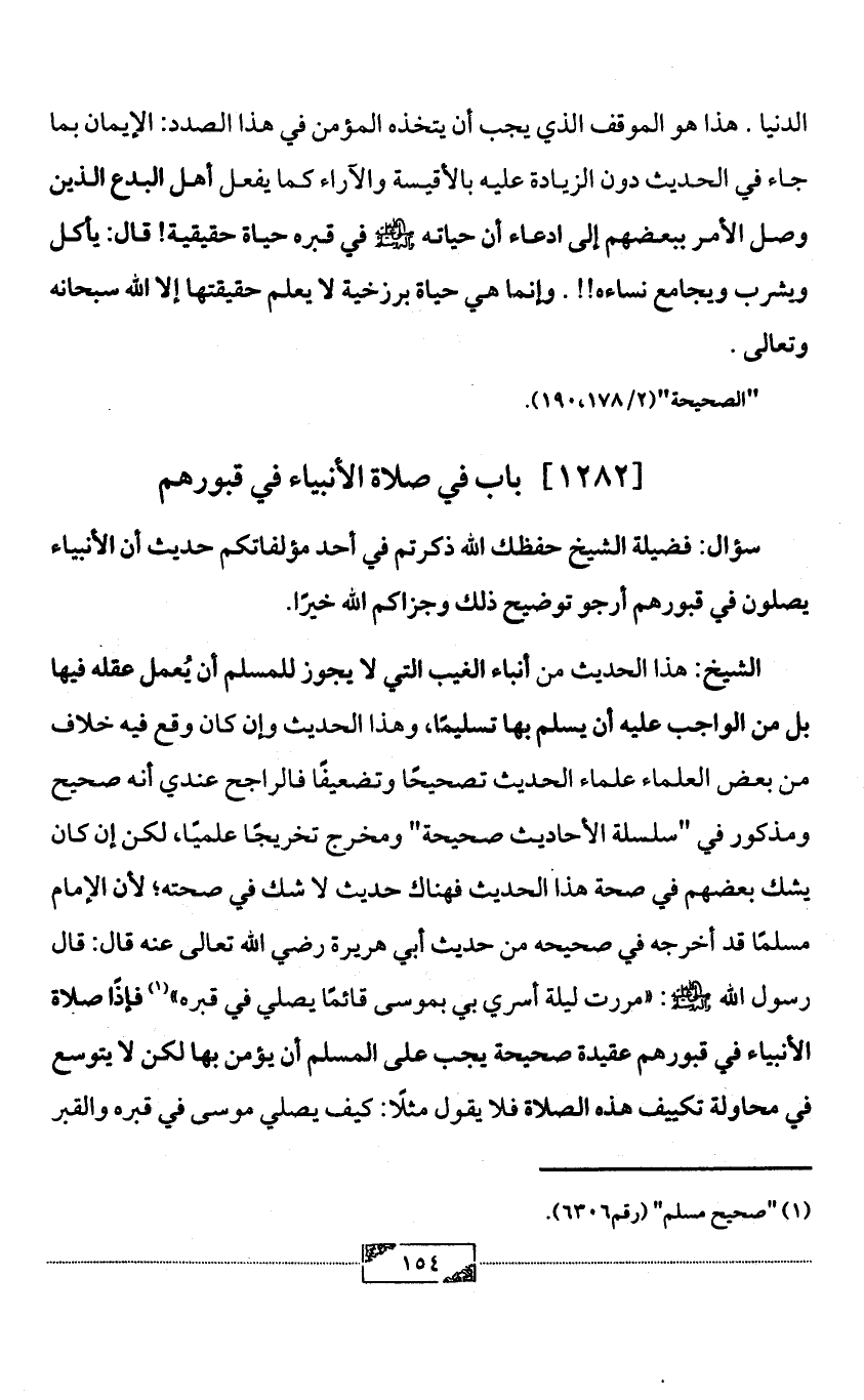 الشيخ: هذا الحديث من أنباء الغيب التي لا يجوز للمسلم أن يُعمل عقله فيها بل من الواجب عليه أن يسلم بها تسليمًا، وهذا الحديث وإن كان وقع فيه خلاف من بعض العلماء علماء الحديث تصحيحًا وتضعيفًا فالراجح عندي أنه صحيح ومذكور في "سلسلة الأحاديث صحيحة" ومخرج تخريجًا علميًا، لكن إن كان يشك بعضهم في صحة هذا الحديث فهناك حديث لا شك في صحته؛ لأن الإمام مسلمًا قد أخرجه في صحيحه من حديث أبي هريرة رضي الله تعالى عنه قال: قال رسول الله - صلى الله عليه وآله وسلم -: «مررت ليلة أسري بي بموسى قائمًا يصلي في قبره» (¬1) فإذًا صلاة الأنبياء في قبورهم عقيدة صحيحة يجب على المسلم أن يؤمن بها لكن لا يتوسع في محاولة تكييف هذه الصلاة فلا يقول مثلًا: كيف يصلي موسى في قبره والقبر