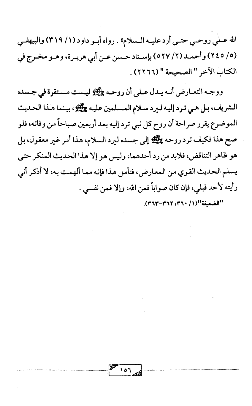 ووجه التعارض أنه يدل على أن روحه - صلى الله عليه وآله وسلم - ليست مستقرة في جسده الشريف، بل هي ترد إليه ليرد سلام المسلمين عليه - صلى الله عليه وآله وسلم -، بينما هذا الحديث الموضوع يقرر صراحة أن روح كل نبي ترد إليه بعد أربعين صباحاً من وفاته، فلو صح هذا فكيف ترد روحه - صلى الله عليه وآله وسلم - إلى جسده ليرد السلام، هذا أمر غير معقول، بل هو ظاهر التناقض، فلابد من رد أحدهما، وليس هو إلا هذا الحديث المنكر حتى يسلم الحديث القوي من المعارض، فتأمل هذا فإنه مما ألهمت به، لا أذكر أني رأيته لأحد قبلي، فإن كان صواباً فمن الله، وإلا فمن نفسي.