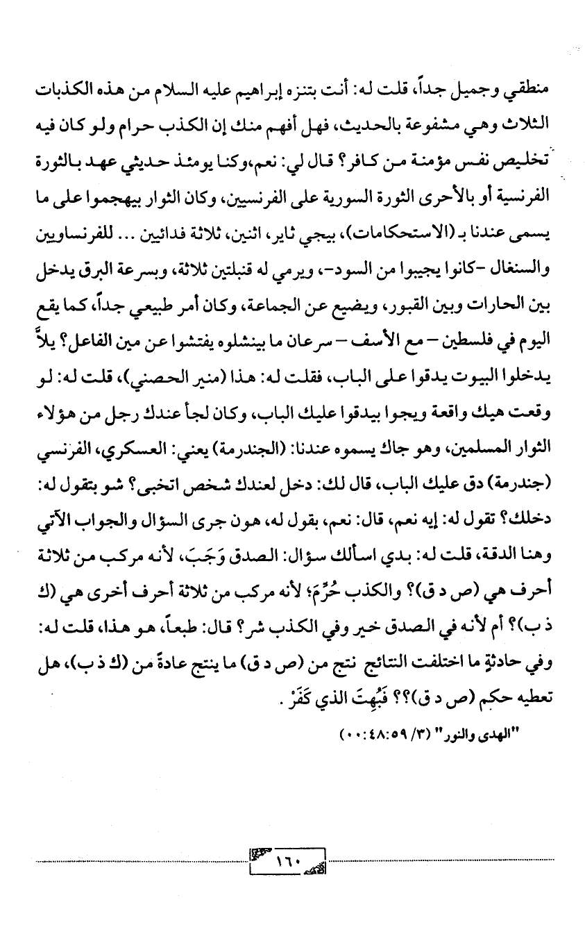 منطقي وجميل جداً، قلت له: أنت بتنزه إبراهيم عليه السلام من هذه الكذبات الثلاث وهي مشفوعة بالحديث، فهل أفهم منك إن الكذب حرام ولو كان فيه تخليص نفس مؤمنة من كافر؟ قال لي: نعم، وكنا يومئذ حديثي عهد بالثورة الفرنسية أو بالأحرى الثورة السورية على الفرنسيين، وكان الثوار بيهجموا على ما يسمى عندنا بـ (الاستحكامات) , بيجي ثاير، اثنين، ثلاثة فدائيين ... للفرنساويين والسنغال -كانوا يجيبوا من السود-، ويرمي له قنبلتين ثلاثة، وبسرعة البرق يدخل بين الحارات وبين القبور، ويضيع عن الجماعة، وكان أمر طبيعي جداً، كما يقع اليوم في فلسطين - مع الأسف - سرعان ما بينشلوه يفتشوا عن مين الفاعل؟ يلاَّ يدخلوا البيوت يدقوا على الباب، فقلت له: هذا (منير الحصني)، قلت له: لو وقعت هيك واقعة ويجوا بيدقوا عليك الباب، وكان لجأ عندك رجل من هؤلاء الثوار المسلمين، وهو جاك يسموه عندنا: (الجندرمة) يعني: العسكري، الفرنسي (جندرمة) دق عليك الباب، قال لك: دخل لعندك شخص اتخبى؟ شو بتقول له: دخلك؟ تقول له: إيه نعم، قال: نعم، بقول له, هون جرى السؤال والجواب الآتي وهنا الدقة، قلت له: بدي اسألك سؤال: الصدق وَجَبَ، لأنه مركب من ثلاثة أحرف هي (ص د ق)؟ والكذب حُرِّمَ؛ لأنه مركب من ثلاثة أحرف أخرى هي (ك ذ ب)؟ أم لأنه في الصدق خير وفي الكذب شر؟ قال: طبعاً، هو هذا، قلت له: وفي حادثةٍ ما اختلفت النتائج نتج من (ص د ق) ما ينتج عادةً من (ك ذ ب)، هل تعطيه حكم (ص د ق)؟؟ فَبُهِتَ الذي كَفَرْ.