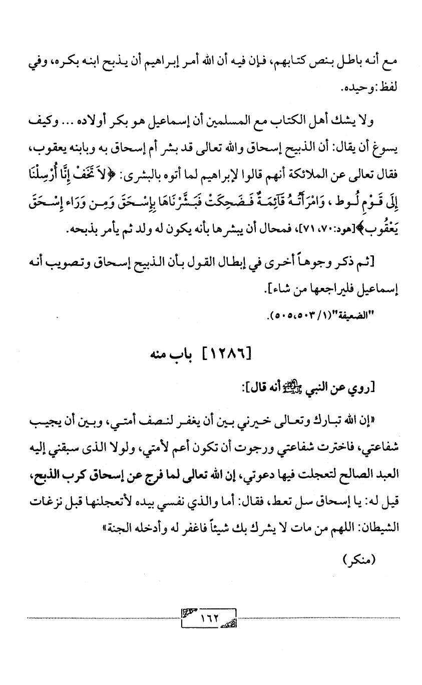 ولا يشك أهل الكتاب مع المسلمين أن إسماعيل هو بكر أولاده ... وكيف يسوغ أن يقال: أن الذبيح إسحاق والله تعالى قد بشر أم إسحاق به وبابنه يعقوب، فقال تعالى عن الملائكة أنهم قالوا لإبراهيم لما أتوه بالبشرى: {لاَ تَخَفْ إِنَّا أُرْسِلْنَا إِلَى قَوْمِ لُوط، وَامْرَأَتُهُ قَآئِمَةٌ فَضَحِكَتْ فَبَشَّرْنَاهَا بِإِسْحَقَ وَمِن وَرَاء إِسْحَقَ يَعْقُوب} [هود:70، 71]، فمحال أن يبشرها بأنه يكون له ولد ثم يأمر بذبحه.