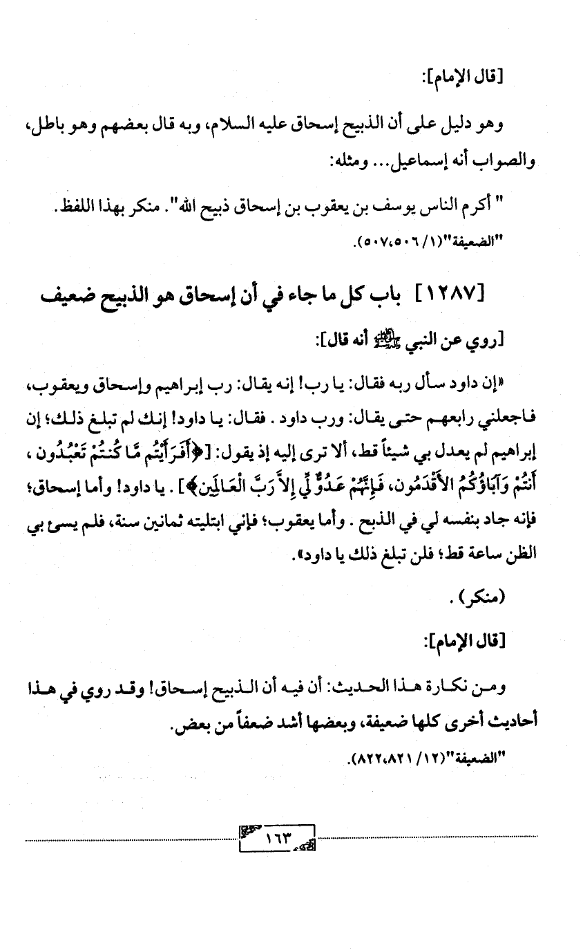 [1287] باب كل ما جاء في أن إسحاق هو الذبيح ضعيف [روي عن النبي - صلى الله عليه وآله وسلم - أنه قال]: