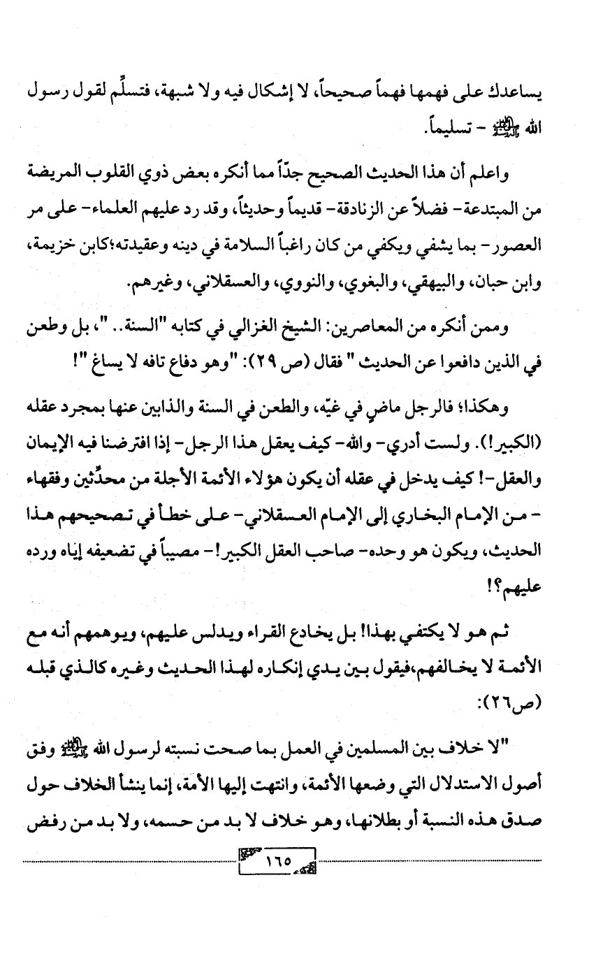 "لا خلاف بين المسلمين في العمل بما صحت نسبته لرسول الله - صلى الله عليه وآله وسلم - وفق أصول الاستدلال التي وضعها الأئمة، وانتهت إليها الأمة، إنما ينشأ الخلاف حول صدق هذه النسبة أو بطلانها، وهو خلاف لا بد من حسمه، ولا بد من رفض