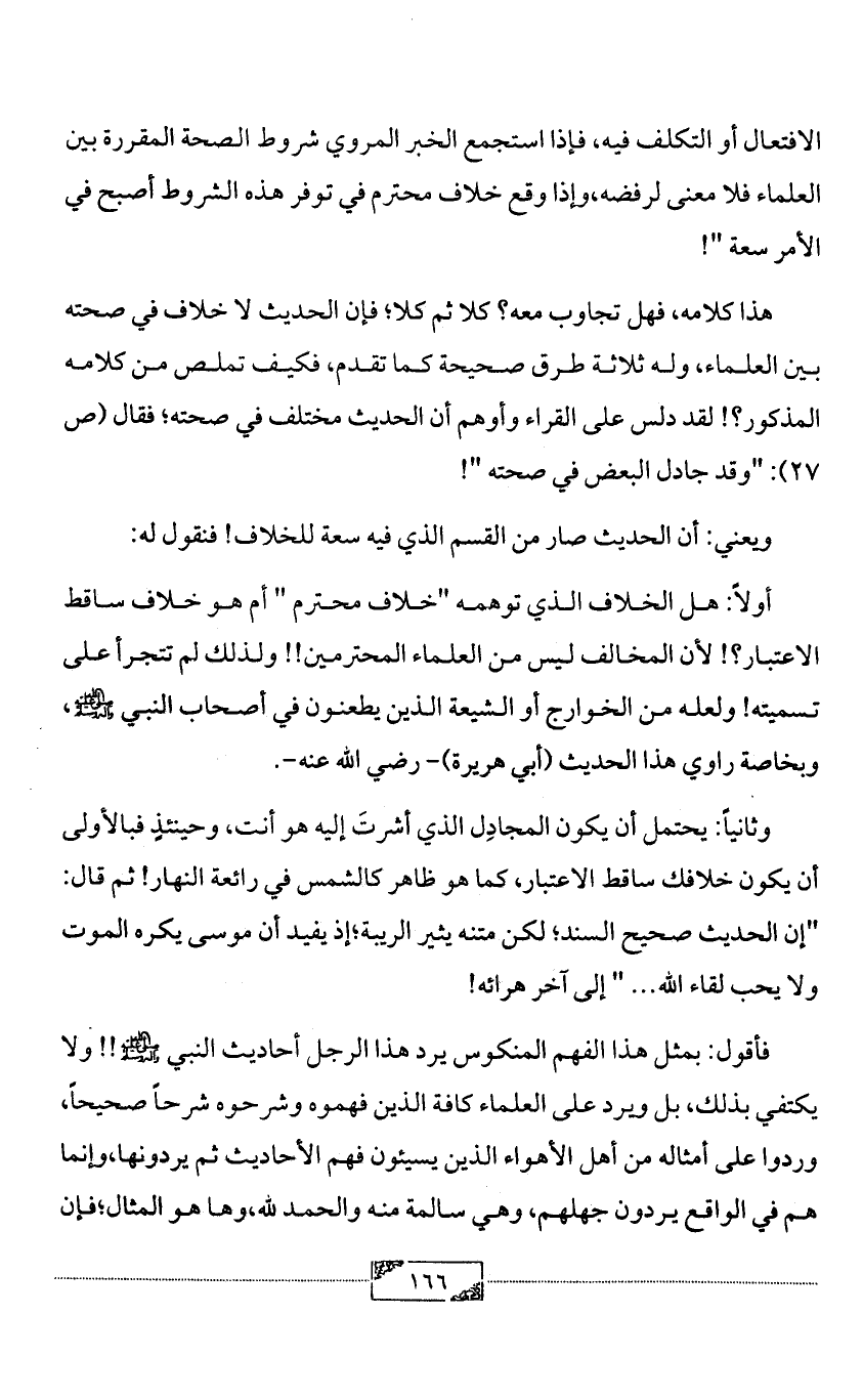 أولاً: هل الخلاف الذي توهمه "خلاف محترم " أم هو خلاف ساقط الاعتبار؟! لأن المخالف ليس من العلماء المحترمين!! ولذلك لم تتجرأ على تسميته! ولعله من الخوارج أو الشيعة الذين يطعنون في أصحاب النبي - صلى الله عليه وآله وسلم -، وبخاصة راوي هذا الحديث (أبي هريرة) - رضي الله عنه-.