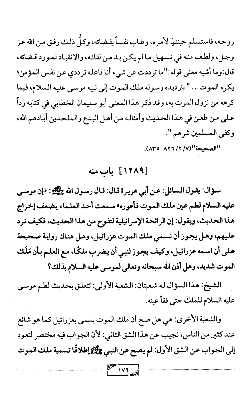 والشعبة الأخرى: هي هل صح أن ملك الموت يسمى بعزرائيل كما هو شائع عند كثير من الناس، نجيب عن هذا الشق الثاني: لأن الجواب فيه مختصر لنعود إلى الجواب عن الشق الأول: لم يصح عن النبي - صلى الله عليه وآله وسلم - إطلاقًا تسمية ملك الموت